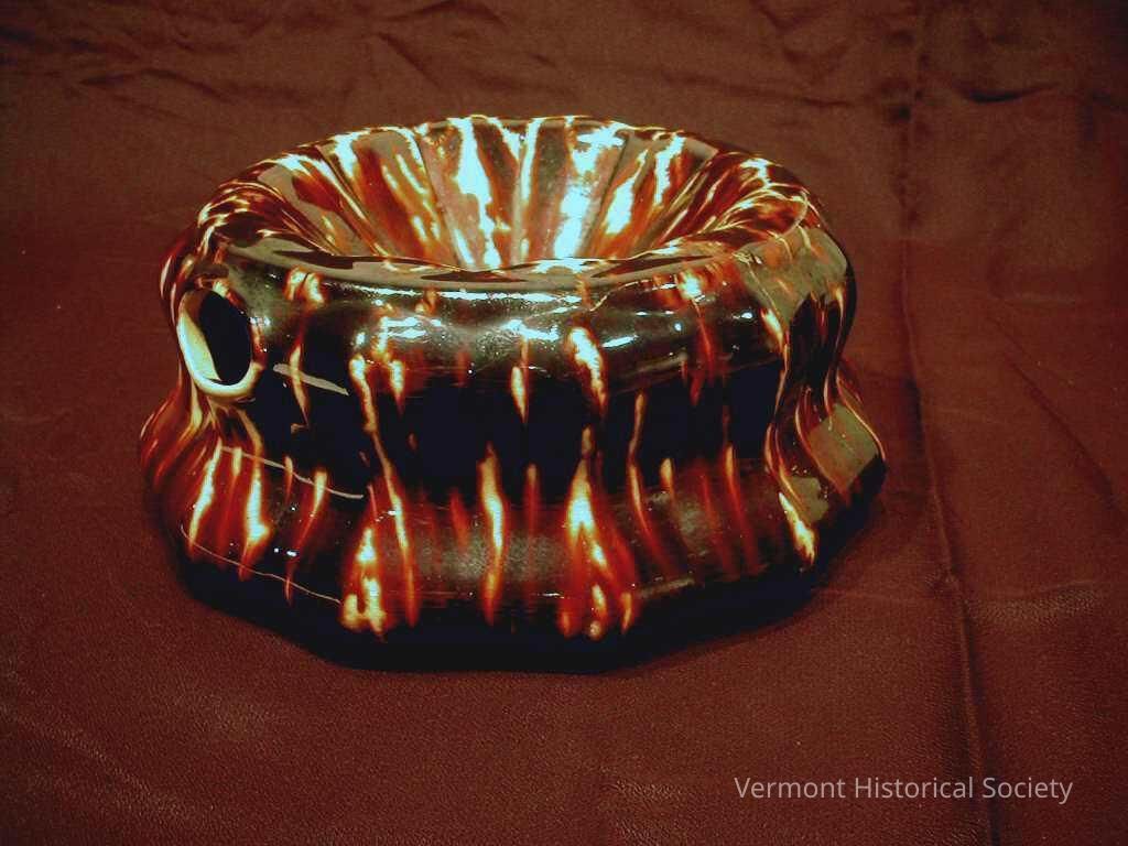 Ceramic spittoon with mottled brown glaze. The body of the spittoon is concave around the exterior, and the top slopes downward to a circular hole. One side has an oval drainage hole.