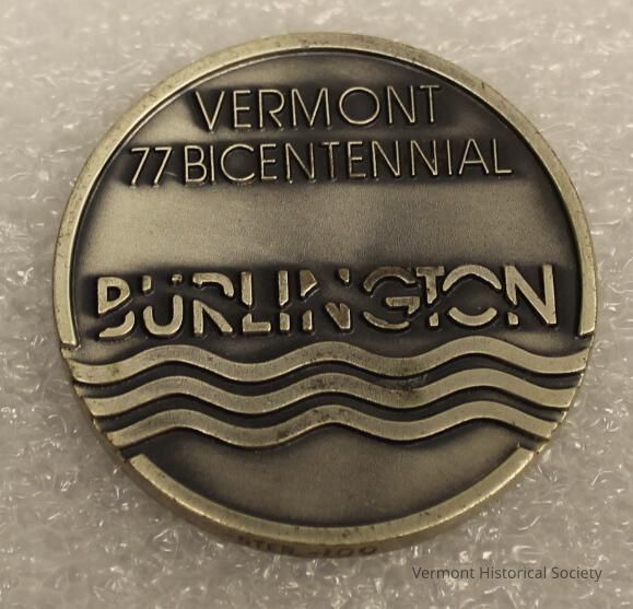 Sterling Silver commemorative medal. One side of the medal is molded with waves across the middle with the inscription, "VERMONT 77 BICENTENNIAL BURLINGTON" above. The other side of the medal is molded with the inscription, "BURLINGTON HARBOR / 1858" around the edge and a scene of ships in water with the Burlington cityscape in the background.Context
