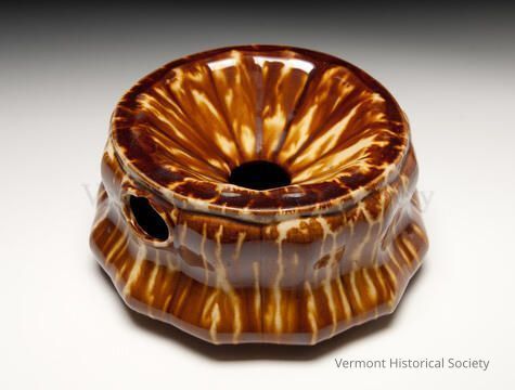 Ceramic spittoon with mottled brown glaze. The body of the spittoon is concave around the exterior, and the top slopes downward to a circular hole. One side has an oval drainage hole. The bottom is impressed with the label, "Lyman Fenton & Co."