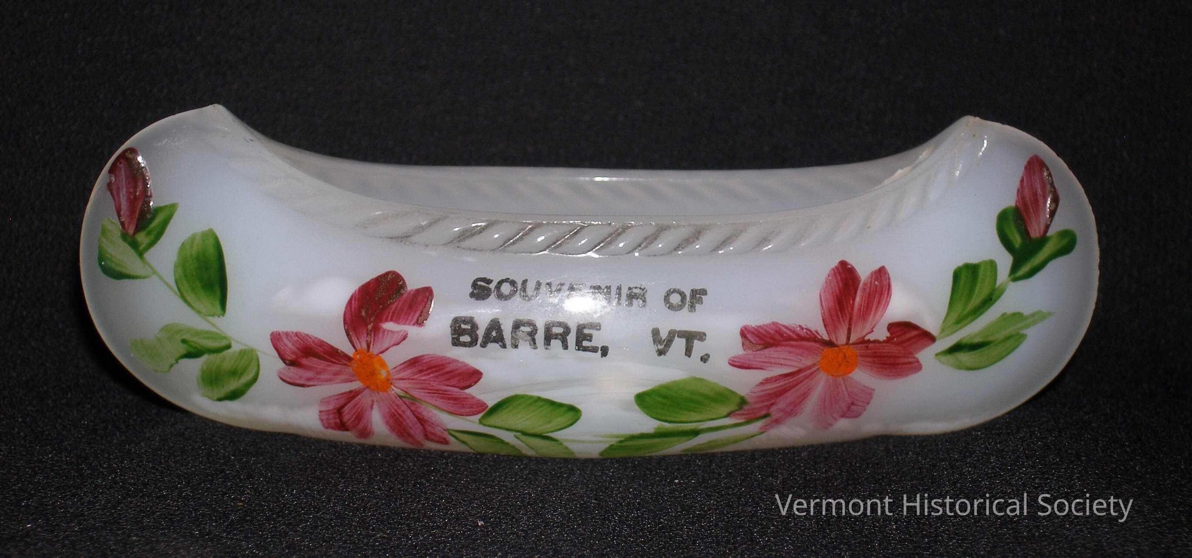 Miniature milk glass canoe. The top edge is molded in a twist or braid shape. One side is painted with pink flowers, green leaves, and the words, "SOUVENIR OF BARRE, VT."