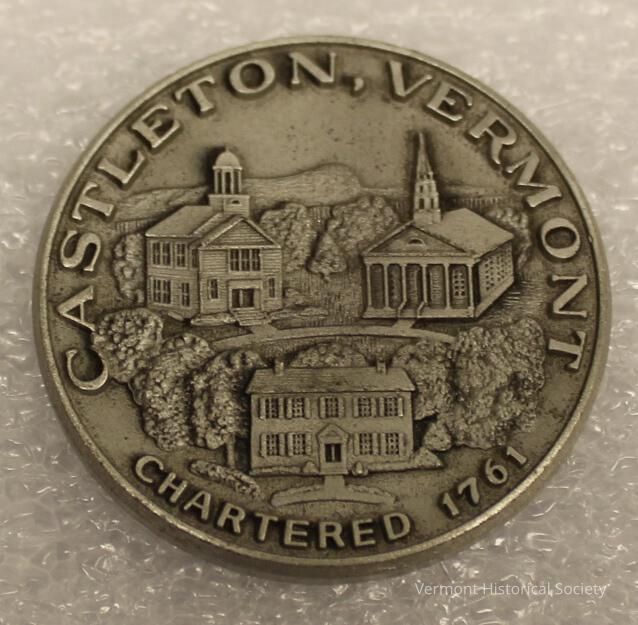 Silver-toned commemorative medal. One side shows a group of buildings, including houses and a church, amid trees with the inscription "CASTLETON, VERMONT / CHARTERED 1761". The other side shows a building with the inscription, "AMERICAN REVOLUTION BICENTENNIAL 1776 - 1976" around the edge and "OLD COBBLERS SHOP" at the bottom.Context