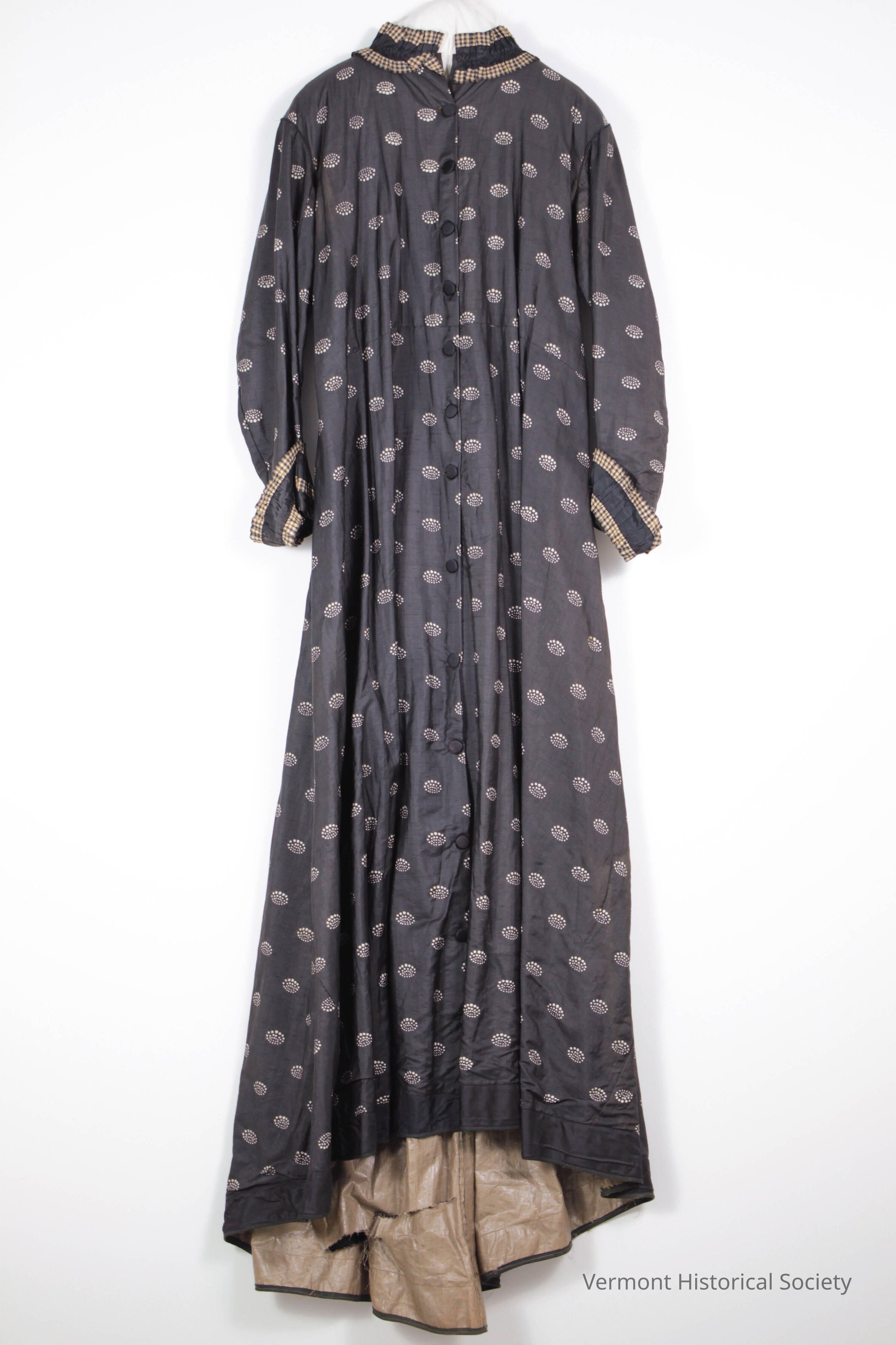 Black silk dressing gown. The silk is printed in white with ovals created from smaller circles. The long sleeves and high collar are trimmed with black silk and black-and-tan plaid silk. The gown opens at the center front and buttons all the way to the floor, but only the top seven buttons are functional. There is a train. The gown is lined in brown glazed cotton, and the hem is bound with narrow black tape.Context