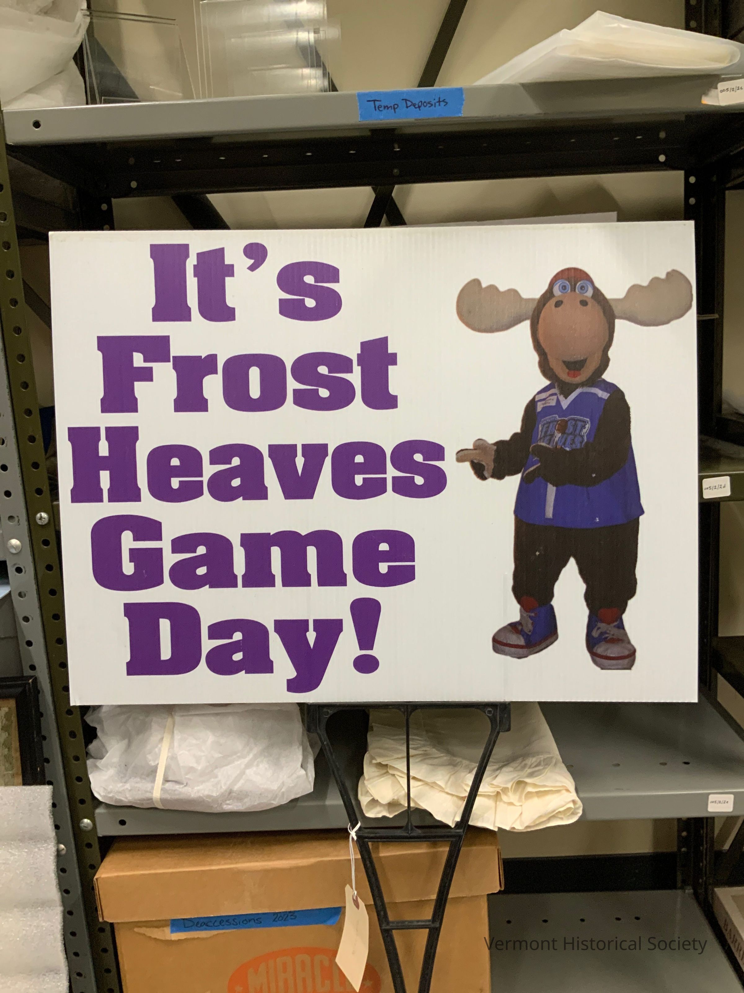 A white yard sign (a) advertising a Frost Heaves game. Purple lettering reads, "It's Frost Heaves Game Day!" with a picture of their mascot, Bump -- a moose dressed in a Frost Heaves jersey -- pointing to the message. The sign (a) is attacked to a black plastic post (b) that is designed so one can use their foot to press the post into the ground. The sign (a) is double-sided with the same message printed on both sides.Context