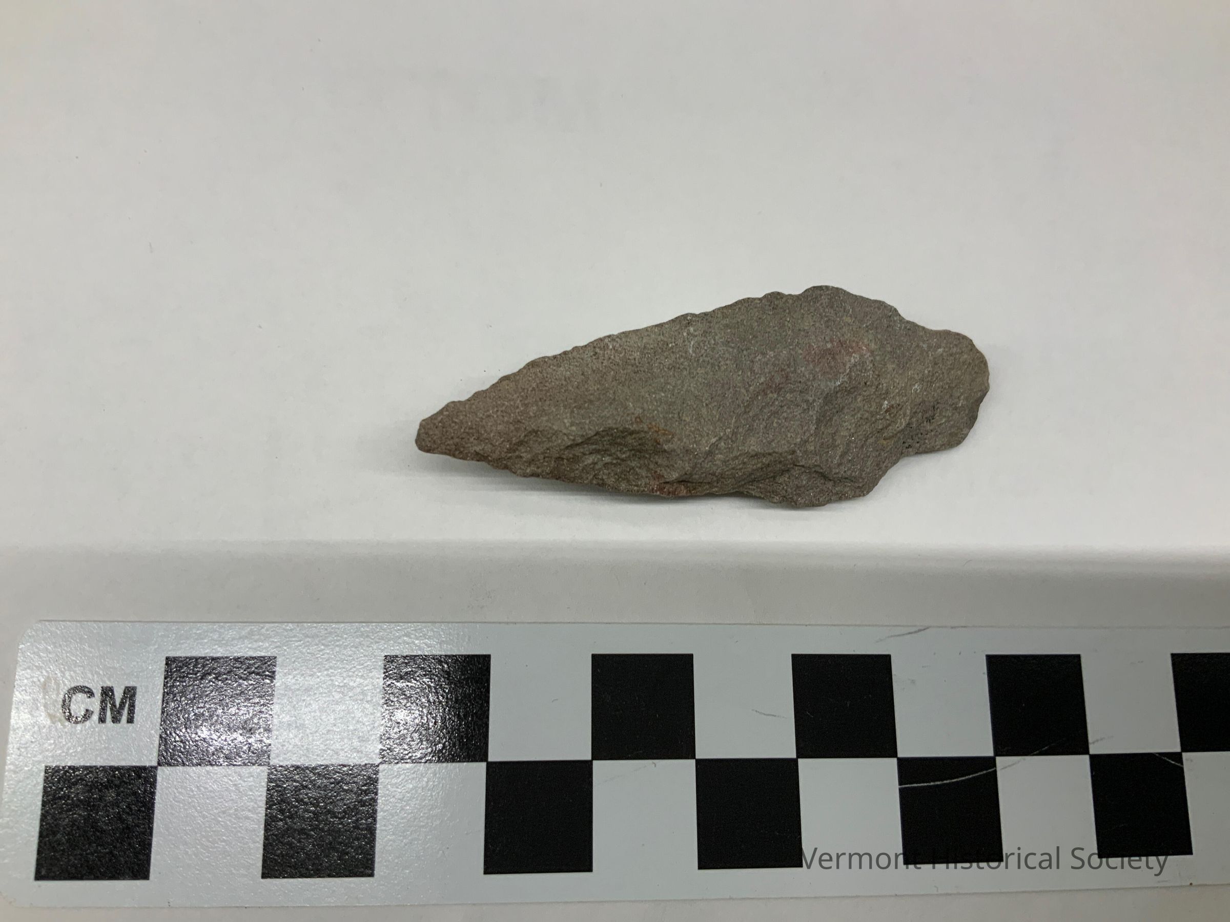 Gray chipped stone projectile point with a straight stem. The base curves outward, and the blade edges are straight.Context