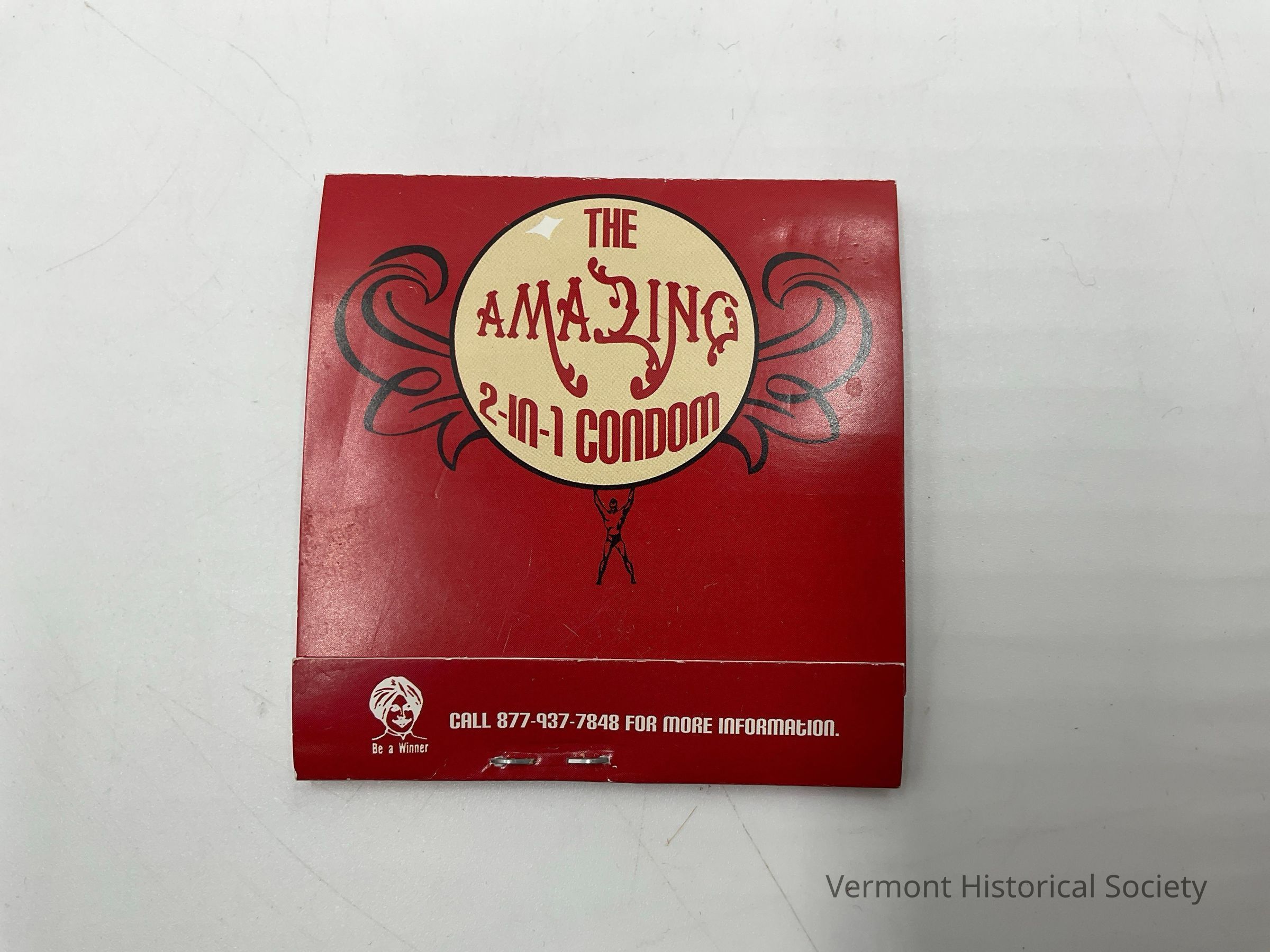 Red matchbook-like package that contains a condom. The cover declares this is "the Amazing 2-in-1 condom. It is a promotion for quitting smoking. Inside it says, "If you want to continue using condoms for what they are meant for, quit smoking today." It gives the phone number for the Vermont Quit Line. "Keep smoking and you might not get it up." But for those who continue to smoke, the package suggests the condom could have other uses such as to store pennies.Use