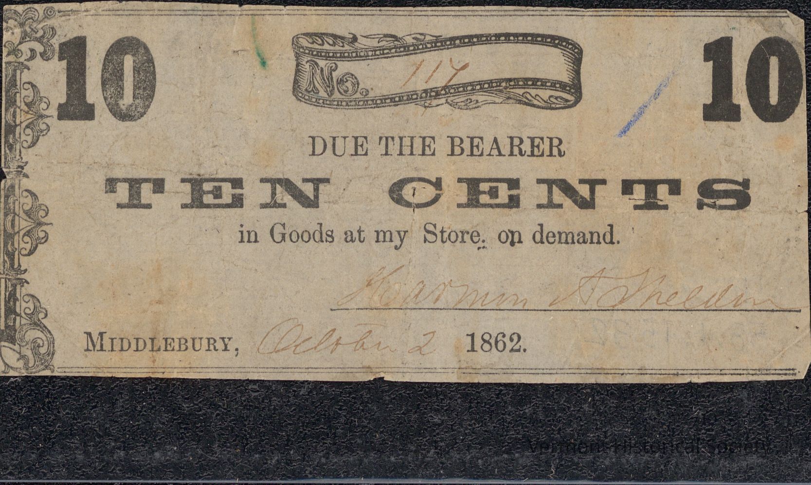 Paper scrip with the inscription, "No. [117] DUE THE BEARER TEN CENTS in Goods at my Store. on demand. [Harmon A. Shelden] Middlebury, [October 2] 1862."
