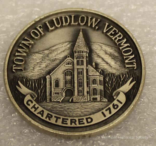 Sterling silver commemorative medal. One side shows a steepled church with trees and a hill in the background. The inscription, "TOWN OF LUDLOW, VERMONT CHARTERED 1761" rings the edge. The reverse is divided into four sections showing a weather vane in the shape of a sheep in the upper left; a train crossing an elevated bridge in the upper right; soldiers pulling a cannon in the lower left; and a sign for the Crown Point Road in the lower right. The edge is etched, "Ster 121".Context
