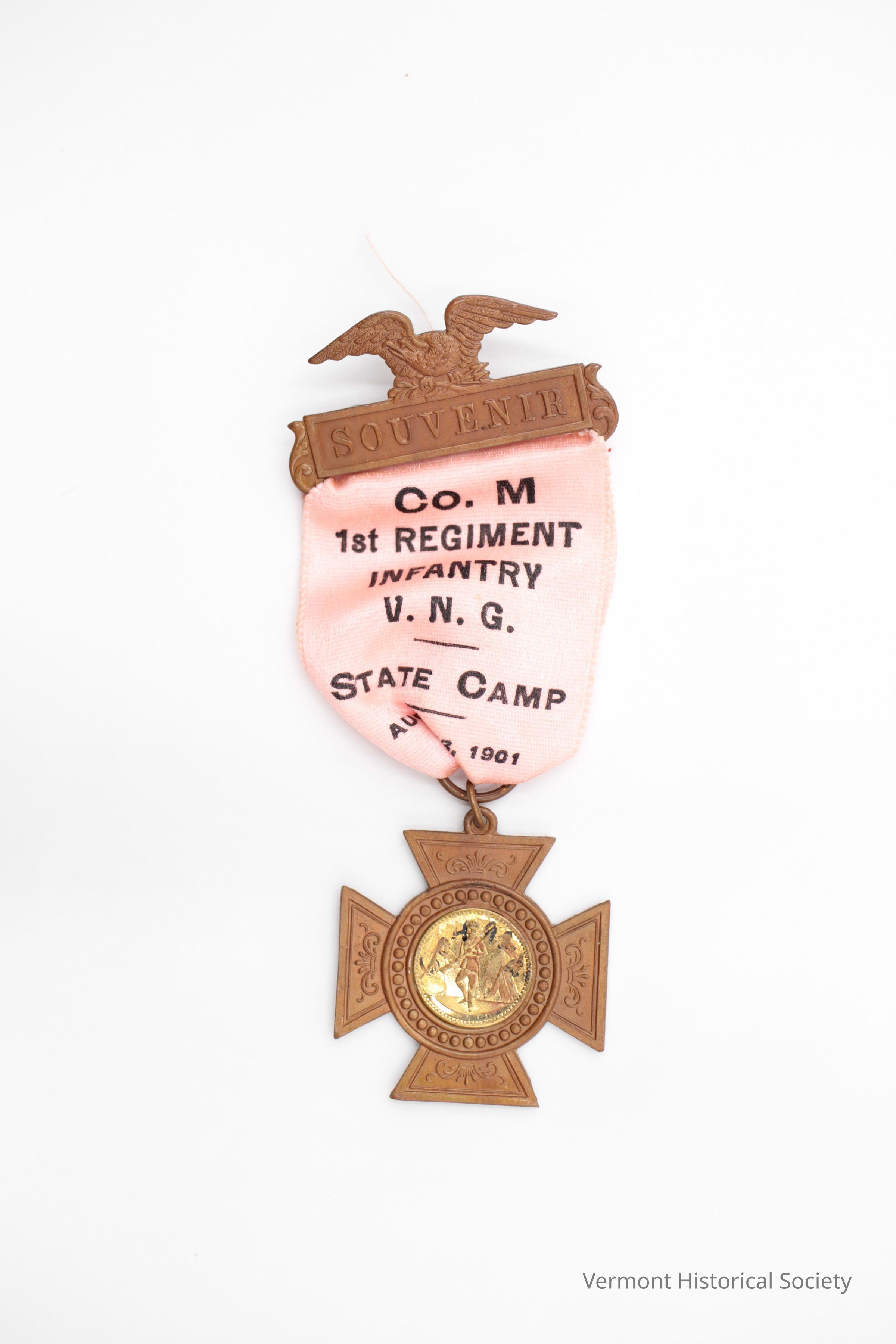 Commemorative ribbon consisting of a bar, ribbon, and medallion. The bar is topped with a flying eagle and says, "SOUVENIR". The pink satin-woven ribbon is printed with the inscription, "Co. M 1st REGIMENT INFANTRY V. N. G. / STATE CAMP / AUG 5-6, 1901". The medallion is in the shape of a cross pattee with a gold disk at the center, molded and enameled to show a man in a military camp. The back of the disk is engraved with the full text of the Lord's Prayer.Context