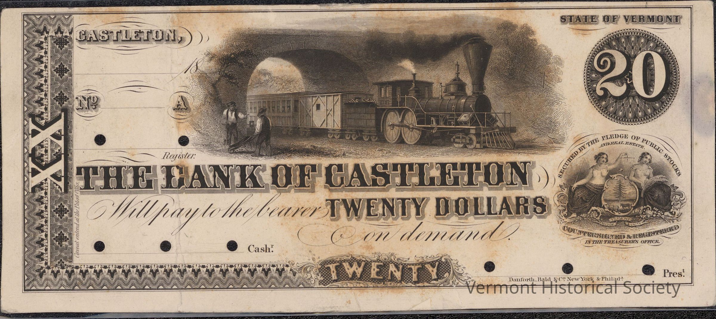 Private bank note for 10 dollars from The Bank of Castleton. It is unsigned and undated. There are circular holes punched through all the blank signature lines.