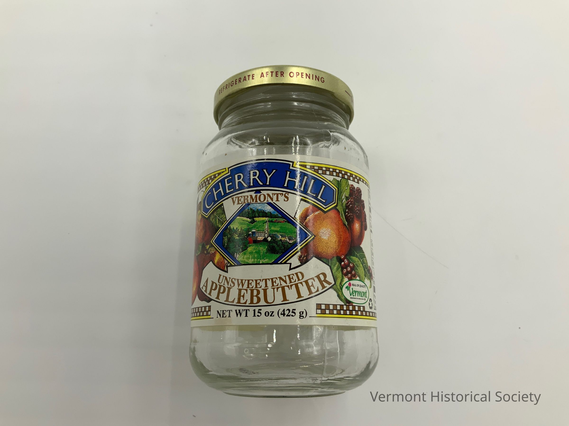Round glass jar with metal twist lid. The lid has text around the edge that reads "OPEN" and "CLOSE" on either side, each with an arrow pointing to the center of the lid, which reads "REFRIGERATE AFTER OPENING" on the The jar has a polychrome printed label for Cherry Hill unsweetened Apple Butter with images of orchard grown fruits and a farmhouse in the center of the label. The label reads "CHERRY HILL / VERMONT'S UNSWEETENED / APPLEBUTTER / NET WT 15 oz (425 g)", and an oval to the side reads "SEAL OF QUALITY / VERMONT." The part of the label that wraps around the back has a full nutrition label.Context
