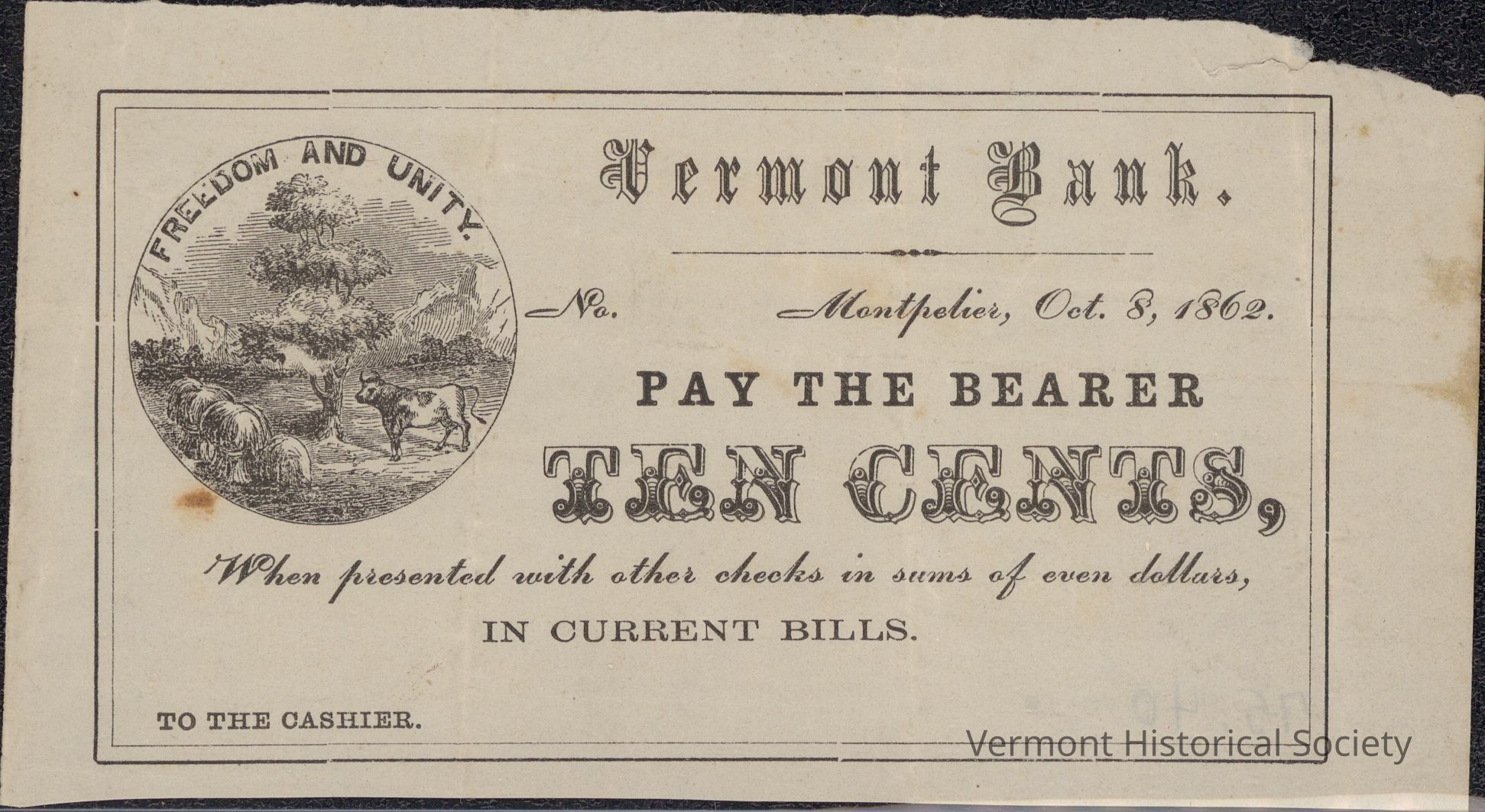 Private bank note for 10 cents from Vermont Bank in Montpelier, Vermont. It is dated Oct. 8, 1862.