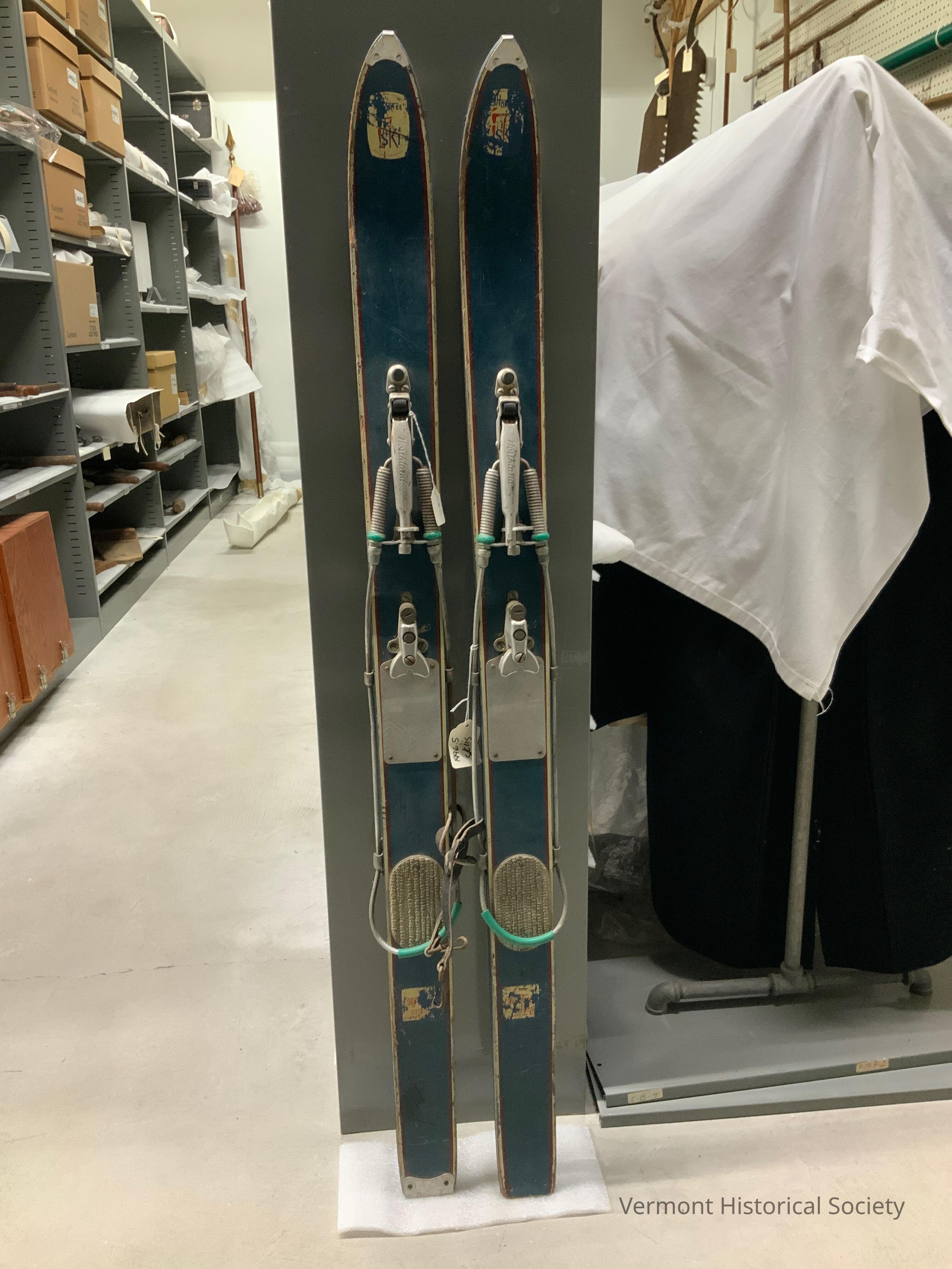 Pair of skis. The skis are blue and short. They are made of wood, with metal, leather, and rubber fastenings, and metal reinforcements on the ends. They end in a point at the far end, and in a flat back. The body of the ski has dimension, thicker behind where the foot would be fastened thinning out to the back end, and thin at the front curving up at the end.Context