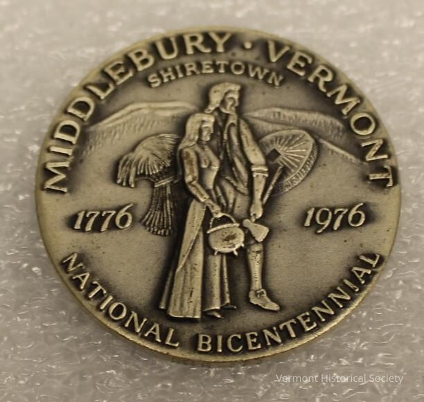 Sterling silver commemorative medal. One side of the medal shows a man and woman standing together looking to the right. the woman is holding a small cauldron and the man is holding a hatchet. There are mountains, a sheaf of wheat, and a millstone in the background with the inscription, "MIDDLEBURY . VERMONT SHIRETOWN 1776 1976 NATIONAL BICENTENNIAL." The other side of the medal shows a tall, four-story building with a square central town topped with a cupola. The building is labeled, "THE OLD CHAPEL", and the inscription, "MIDDLEBURY COLLEGE", rings the edge.Context