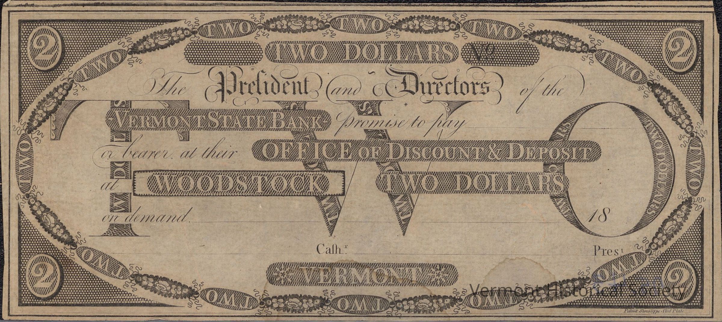 Private bank note for 2 dollars from Vermont State Bank in Woodstock, Vermont. It is unfilled and unsigned.