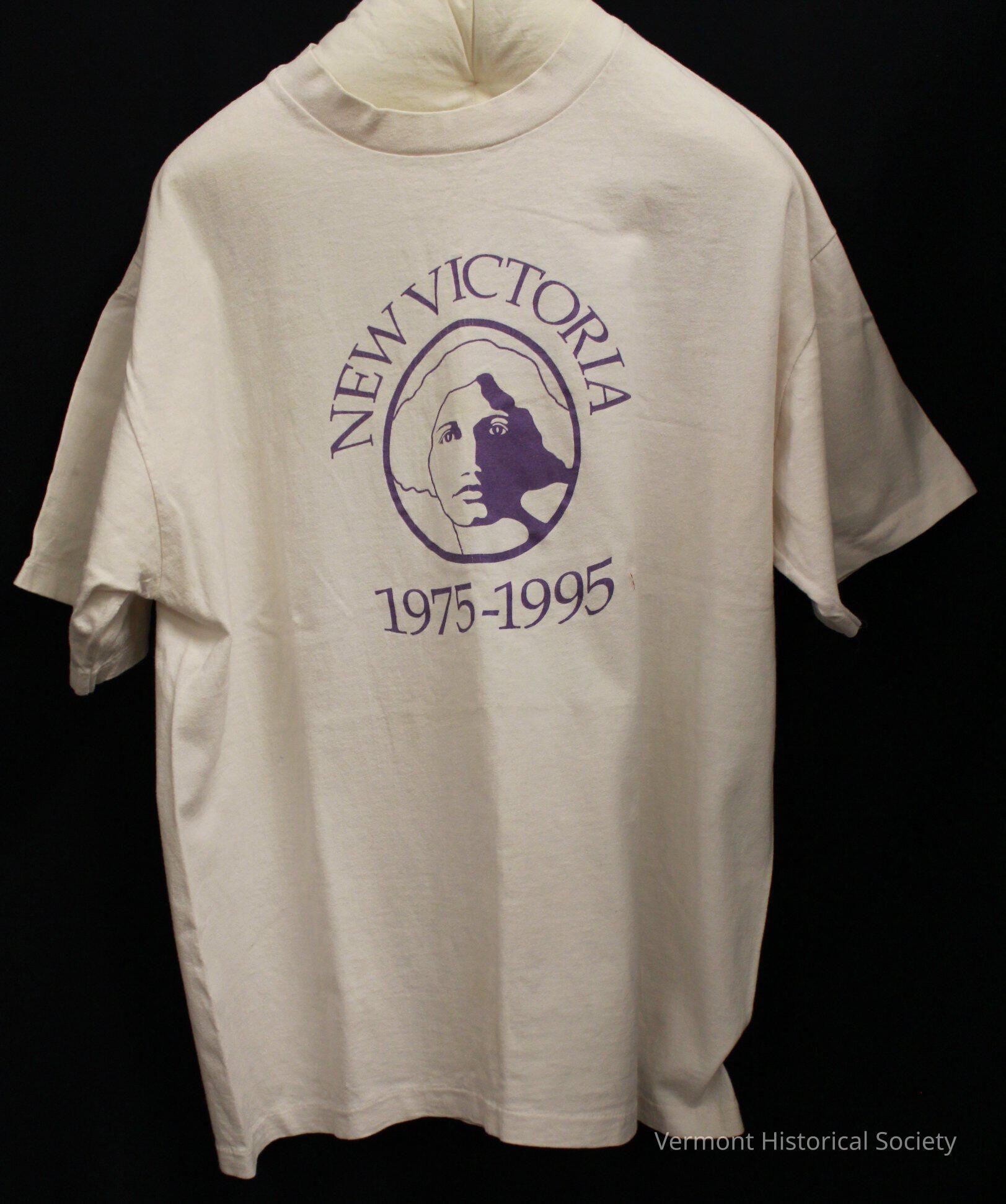 White t-shirt with purple logo in center and printed above: "NEW VICTORIA" and below: "1975-1995" Labels at neck gives maker: "Hanes" with washing instructions, etc.