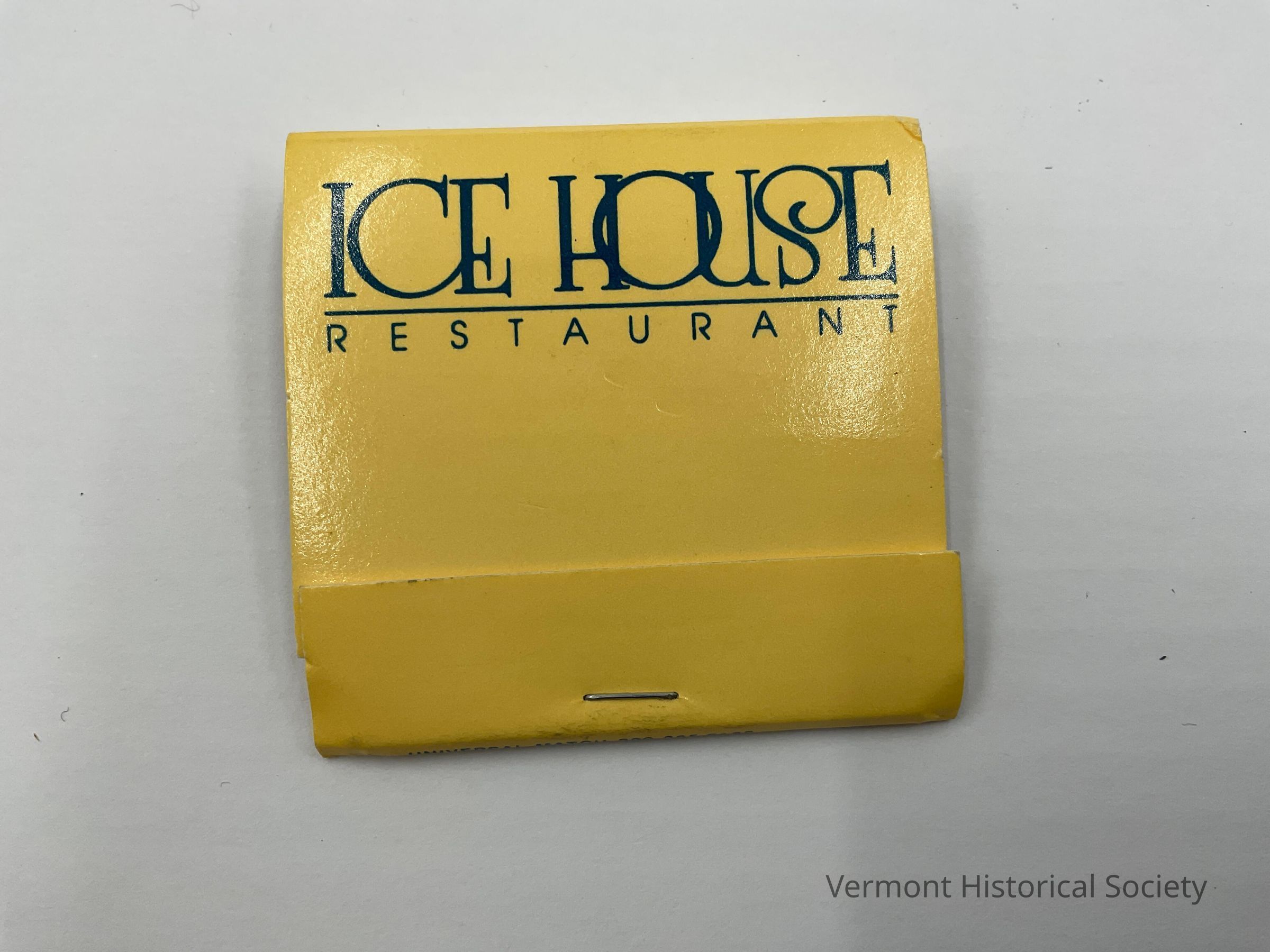 Yellow matchbook with blue lettering that says, "Ice House Restaurant." At the bottom of the front flap is a warning -- "Be safe, Close cover before striking, Keep away from children." The manufacturer, printed on the bottom edge, is "Universal Match, 800-325-8165, Made in Canada." On the back in blue lettering -- "On the Waterfrong, 171 Battery St., Burlington, Vermont." There are white-tipped matches.Context