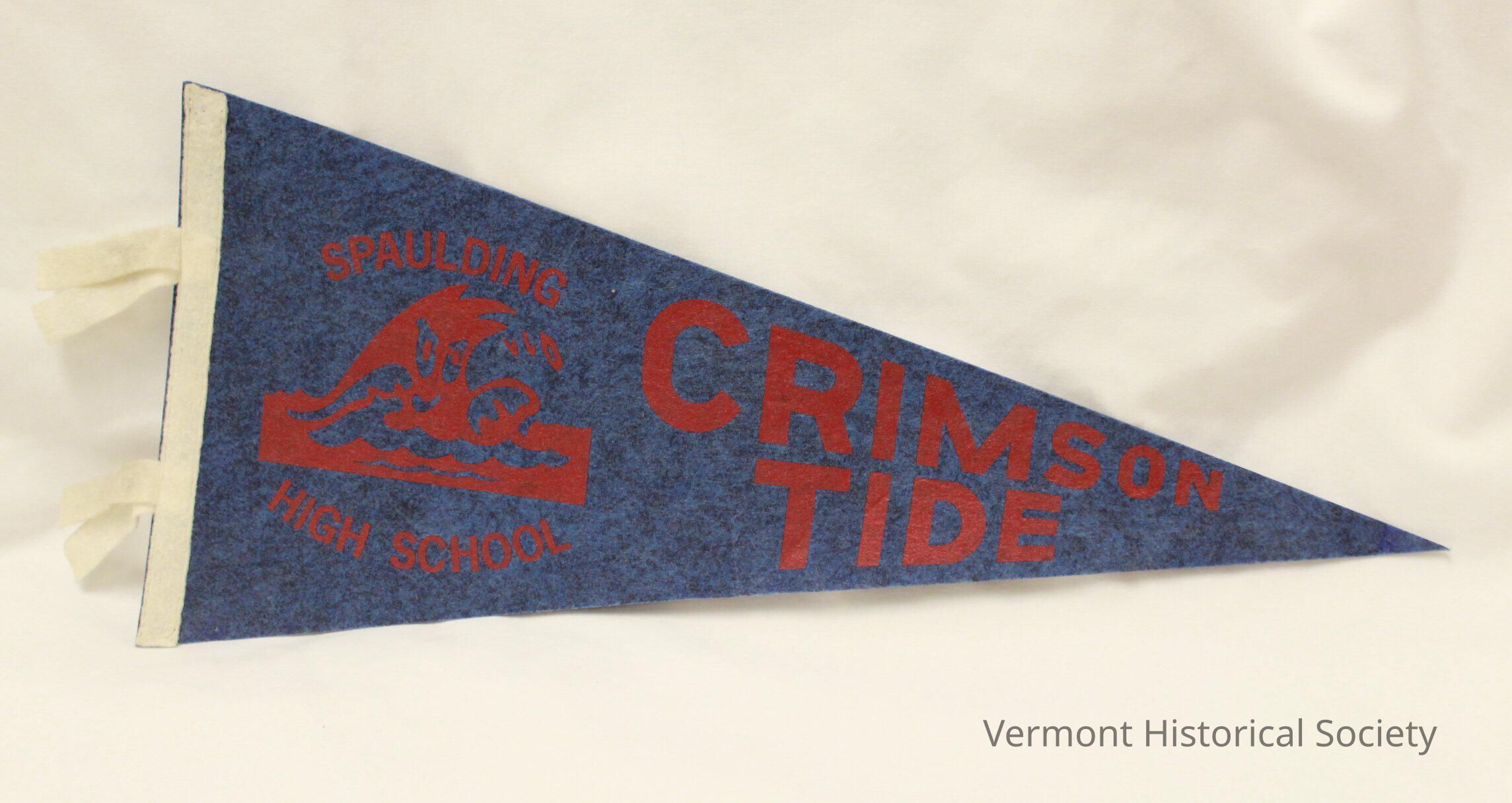 Blue wool felt pennant printed in red with the words "CRIMSON TIDE". Toward the wide end is a logo consisting of a personified ocean wave with the words, "SPAULDING HIGH SCHOOL". The wide end is appliqued with a strip of white felt and there are four white felt strips attached to the pennant for tying.