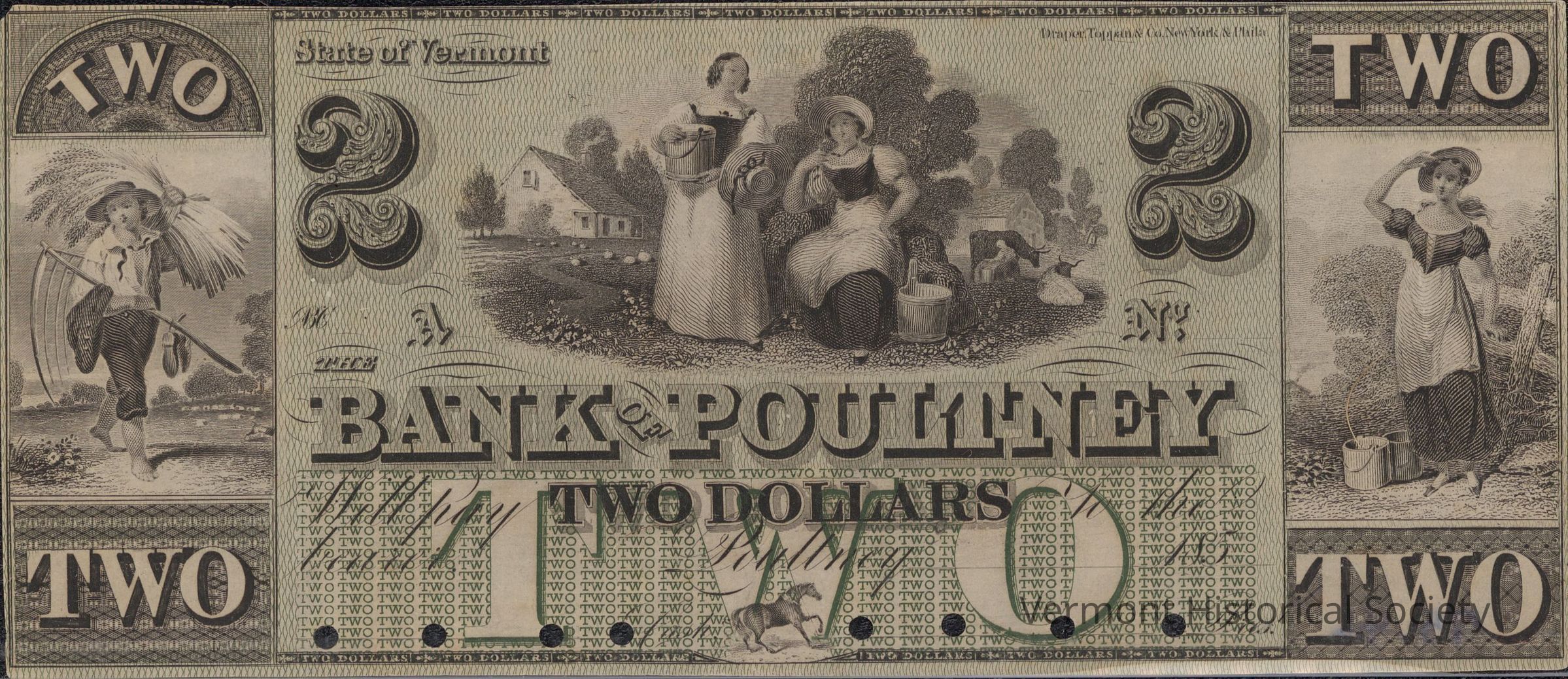 Private bank note for 2 dollars from The Bank of Poultney. It is unfilled and unsigned. The center ground is printed with a repeating linework pattern, giving the bill a green appearance. There are circular holes along the bottom.