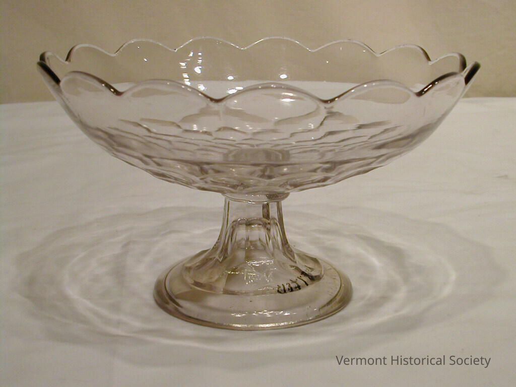 Clear molded glass compote. The compote consists of a rounded bowl on a stem. The bowl is shaped from several round facets.
