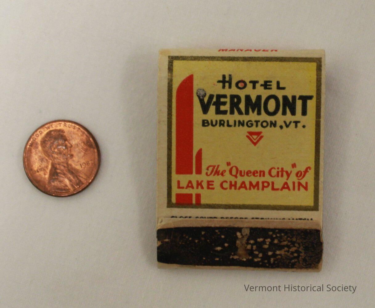 This is a paper matchbook advertising Hotel Vermont in Burlington, Vermont/ the Queen City of Lake Champlain. On the spine, it states: John Harding manager". The back of the matchbook has a colored sketch of the hotel. There are matches with red heads attached to the inside. The striking surface has been used.Context