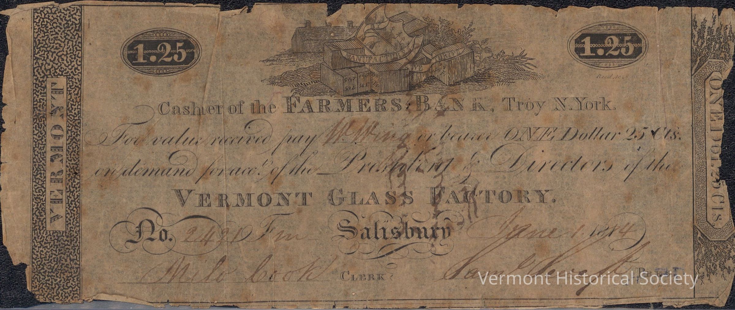 Private bank note with the inscription, "Cashier of the FARMERS BANK, Troy N. York. For value received, pay [W. Wing] or bearer, ONE Dollar 25 Cts. on demand, for acct. of the President & Directors of the VERMONT GLASS FACTORY. No. [2421] F[ree] Salisbury [June 1] 181[4] [Milo Cook] Clerk [Saml. Swift] Prest."
