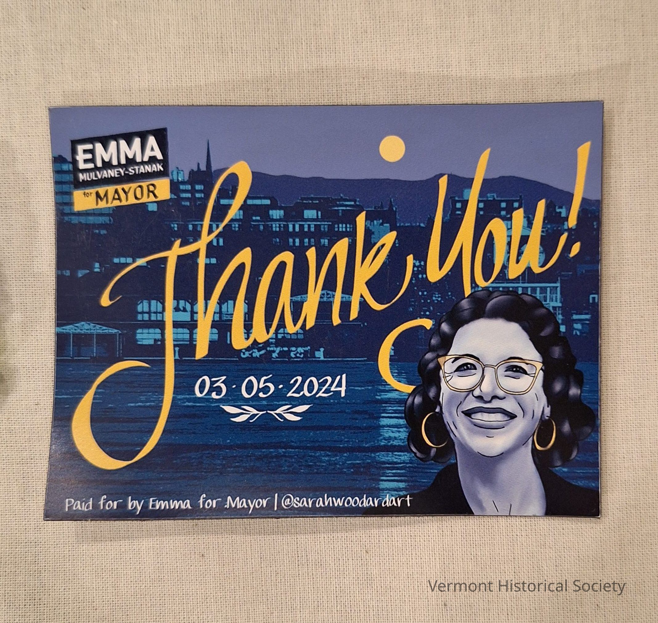 Campaign magnet from the Emma for Mayor campaign, thanking voters. The magnet shows the Mayor's campaign logo in the upper left corner, "Thank You!" in yellow script and the date "03-05-2024" at the center overlaying an image of the Burlington waterfront. A drawn image of Mulvaney-Stanak's face is in the lower right corner. "Paid for by Emma for Mayor | @sarahwoodardart" is in white script in the lower left.