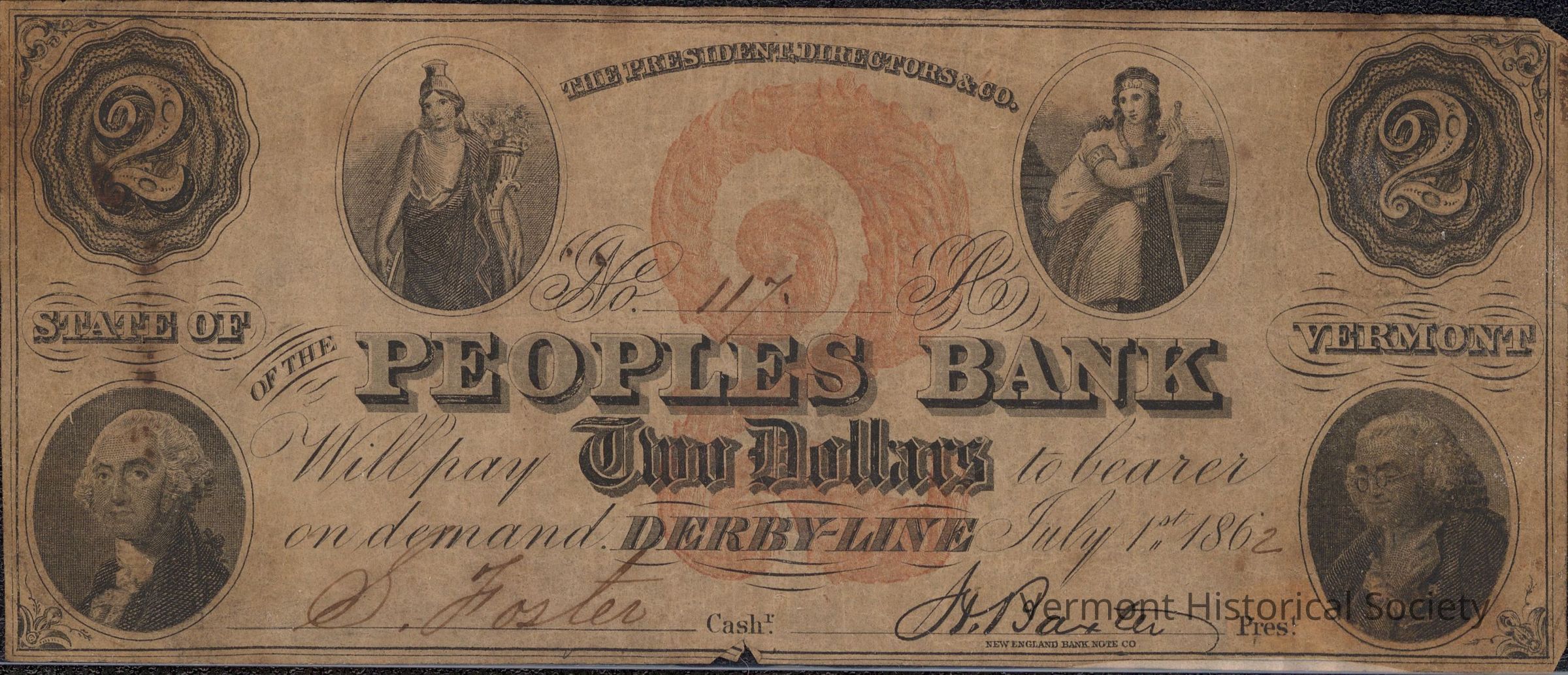 Private bank note for 2 dollars from The Peoples Bank in Derby Line, Vermont. The serial number is 117 and it is dated July 1st, 1862. It is signed S. Foster (cashier) and H. Baxter (president).