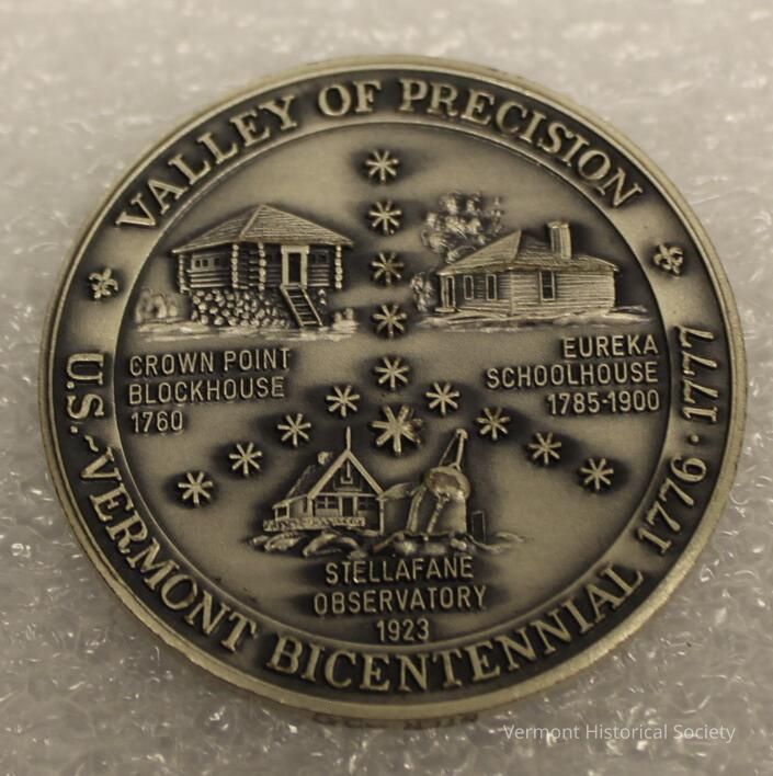 Sterling silver commemorative medal. One of the medal is molded with the inscription, "TOWN OF SPRINGFIELD . VERMONT . 1761" around the edge and an image of a man in shorts and v-necked shirt holding a scroll and mallet in front of a field scene. The other side is molded with the inscription, "VALLEY OF PRECISION . U.S.-VERMONT BICENTENNIAL 1776 . 1777", around the edge. The center is separated into three sections: one shows a raised log cabin labeled, "CROWN POINT BLOCKHOUSE 1760"; one shows a small clapboard building labeled, "EUREKA SCHOOLHOUSE 1785-1900"; and one shows a building with a large telescope labeled, "STELLAFANE OBSERVATORY 1923".Context