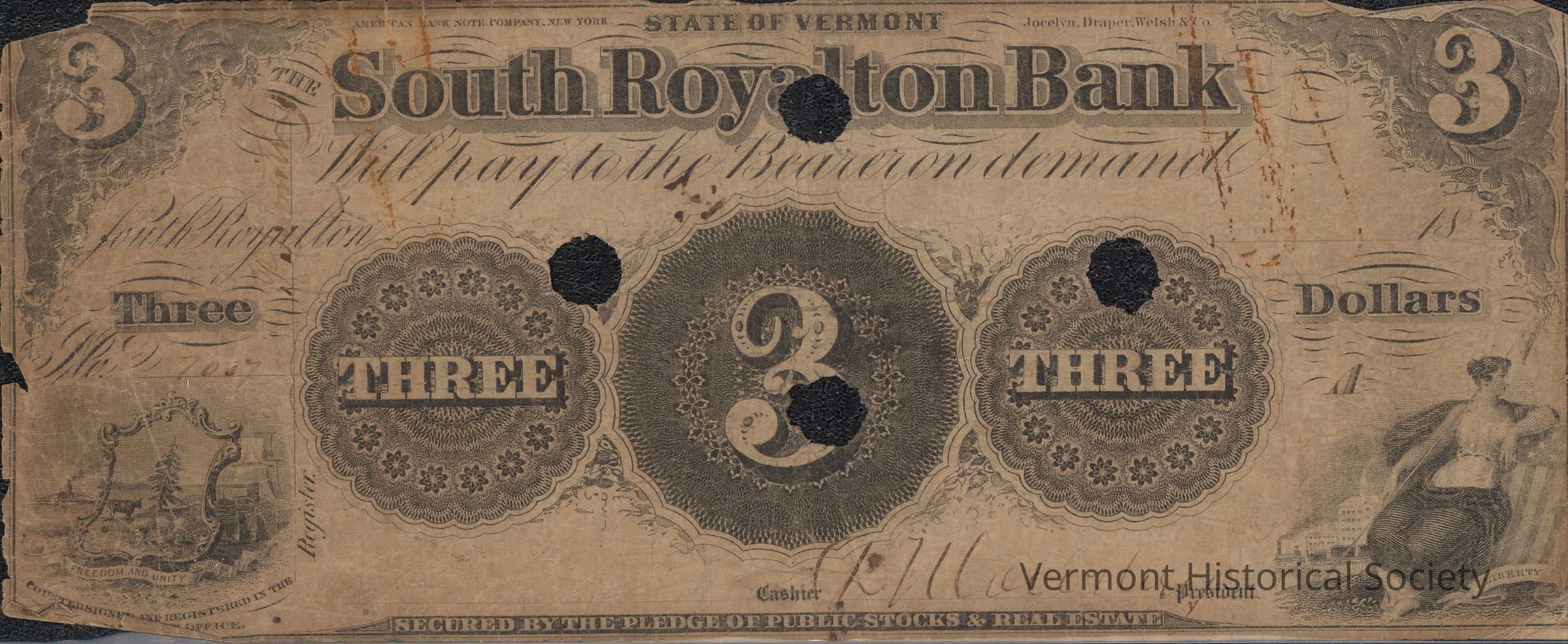Private bank note for 3 dollars from the South Royalton Bank in South Royalton, Vermont. It is undated, and the serial number is 7037. There are four circular holes punched through the bill in a diamond shape.