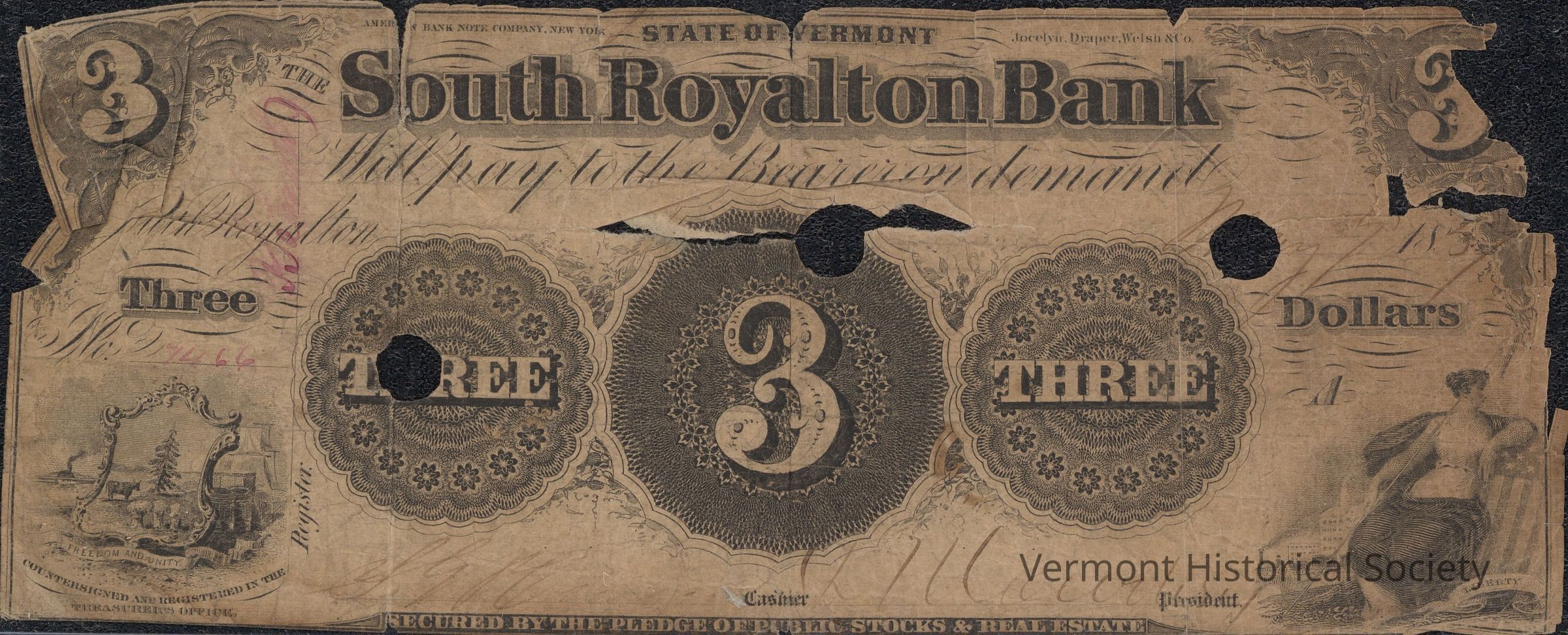 Private bank note for three dollars from the South Royalton Bank in Royalton, Vermont. The serial number is 7466, and it is dated May 1, 1857. There are three circular holes punched through the bill.