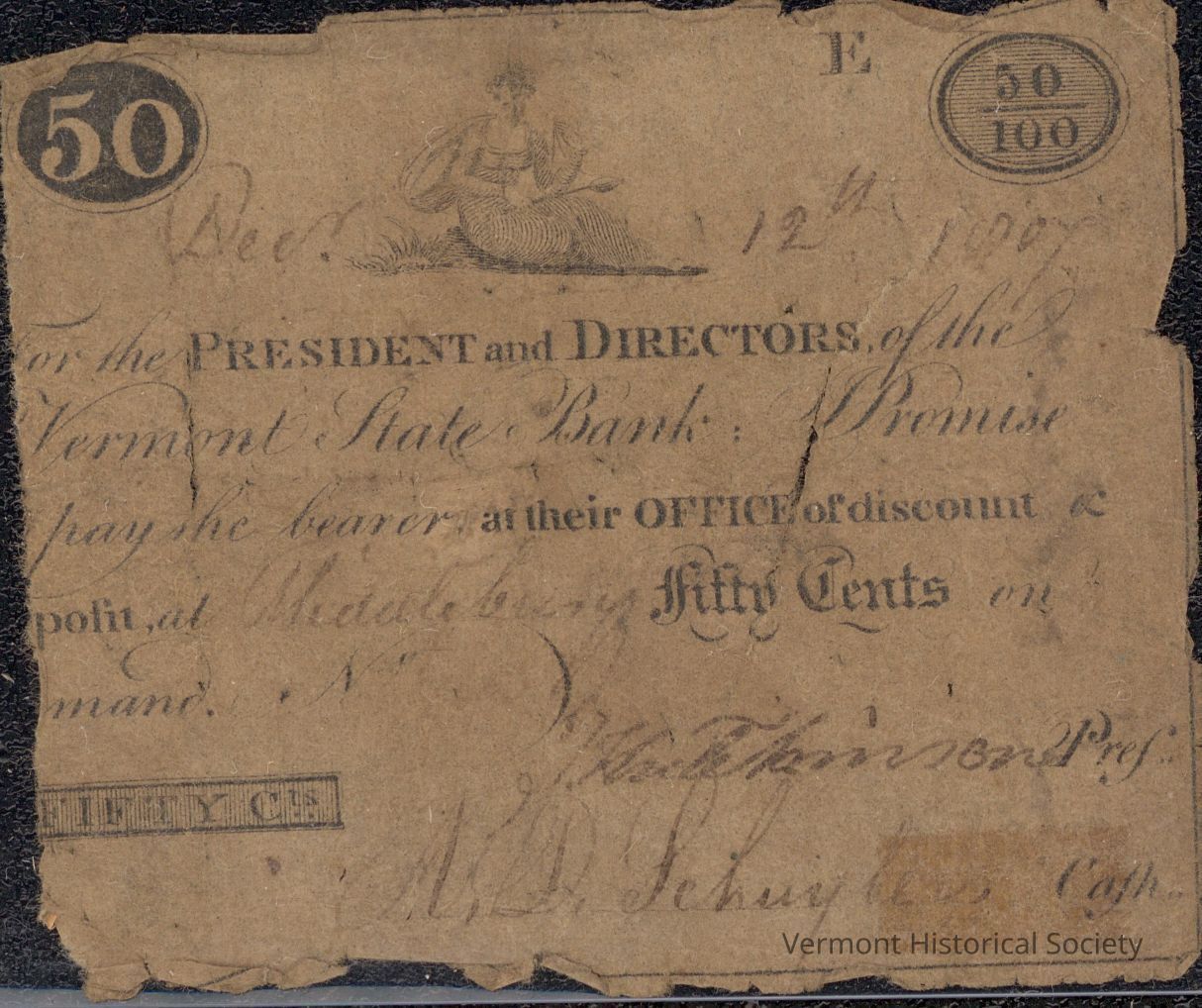Private bank not for 50 cents from Vermont State Bank in Middlebury. It is dated December 12th, 1807.