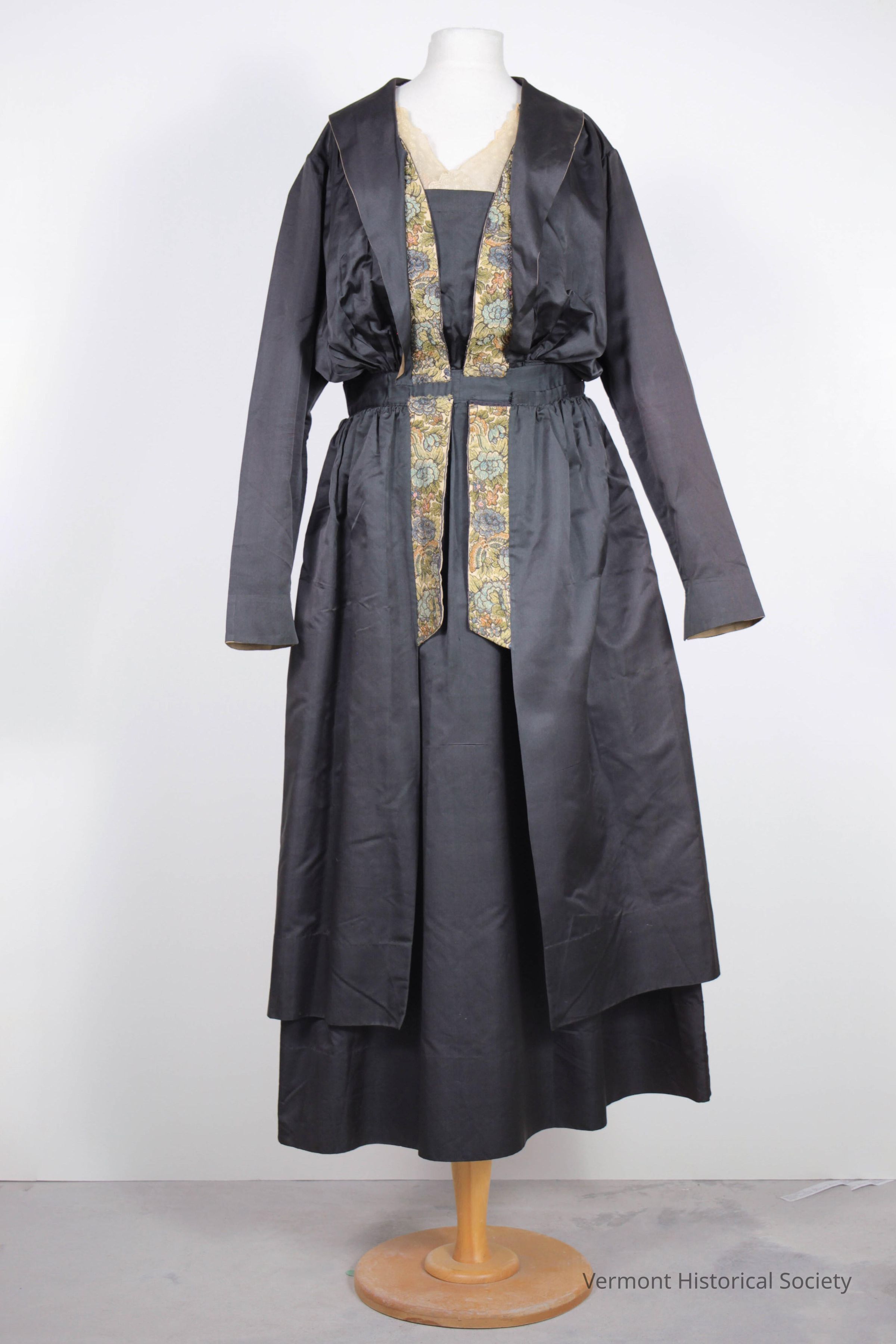 Black satin-woven silk dress. The dress has long sleeves as is constructed in one piece to appear to be several layers: an outer dress, a vest, and an underdress. The outer layer has a shawl collar that extends to the waistline, which sits near the wearer's natural waist. There are two colorfully printed floral bands between the two black layers. The neckline has white lace in a V-shaped surplice.Context