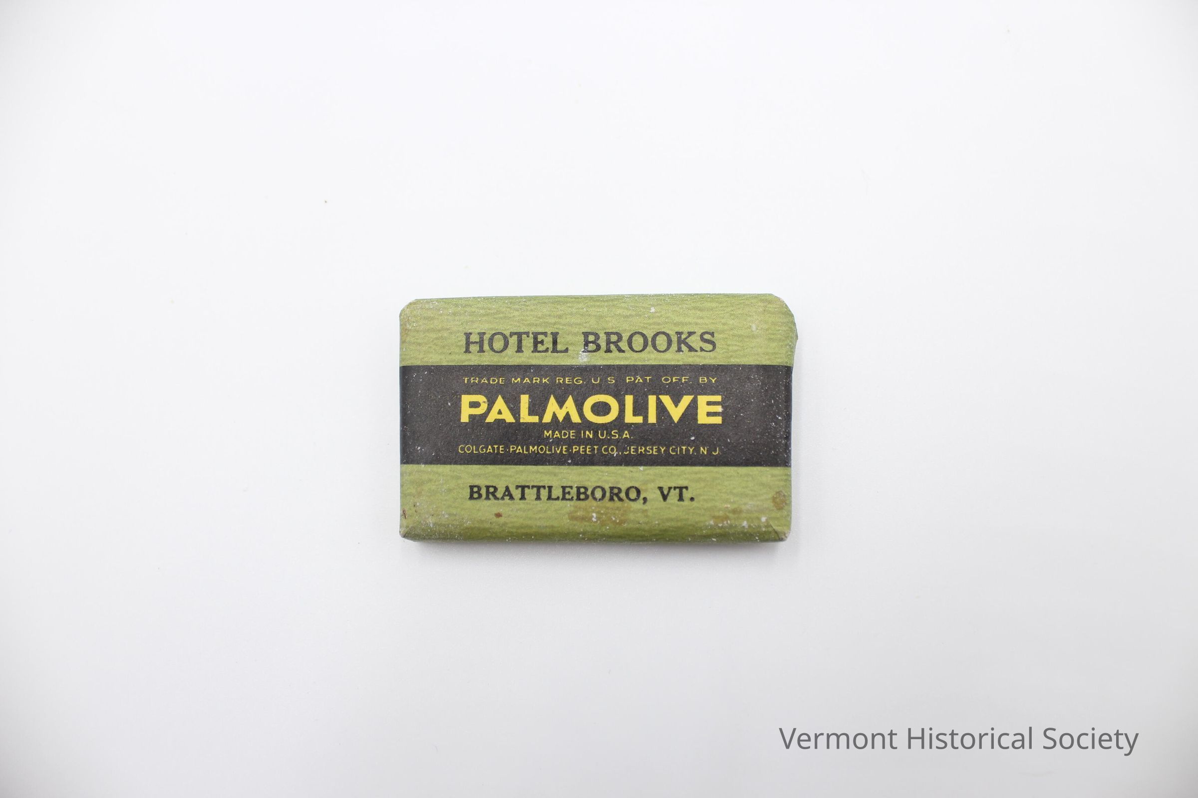 Small bar of ivory soap wrapped in green paper. The wrap has a black stripe across the center and bears the inscription "HOTEL BROOKS/BRATTLEBORO, VT." on either side of the stripe, and "PALMOLIVE" and the associated trademark information within the strip. The back has the logo for the American Hotel Association, as well as the label, "HOTEL BROOKS/BRATTLEBORO, VT."Context
