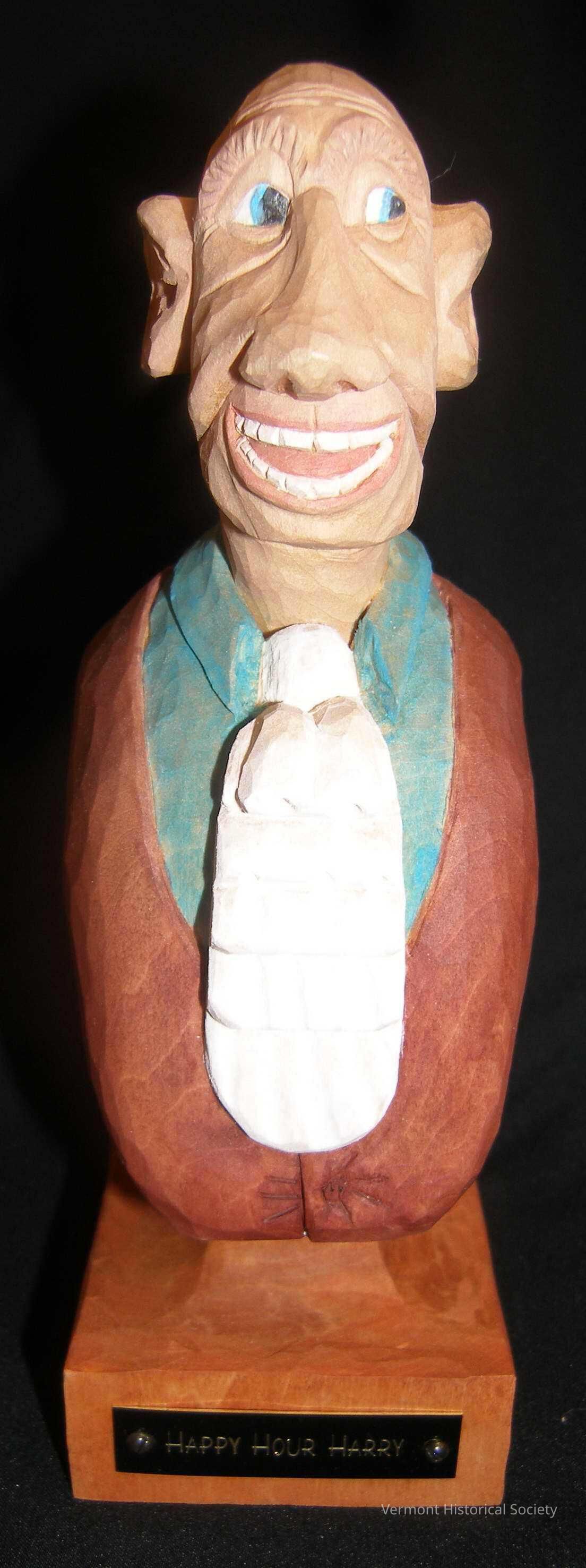 Carved wooden caricature bust of a smiling man with a large, white tie. The man is bald with protruding ears, a wide small, a large nose, and blue eyes looking to the side. He is wearing a brown sweater and a blue collared shirt. The bust sits on a square base with a metal plaque that reads, "HAPPY HOUR HARRY". The back of the base is burned with the label, "JP Washburn 2007".Context