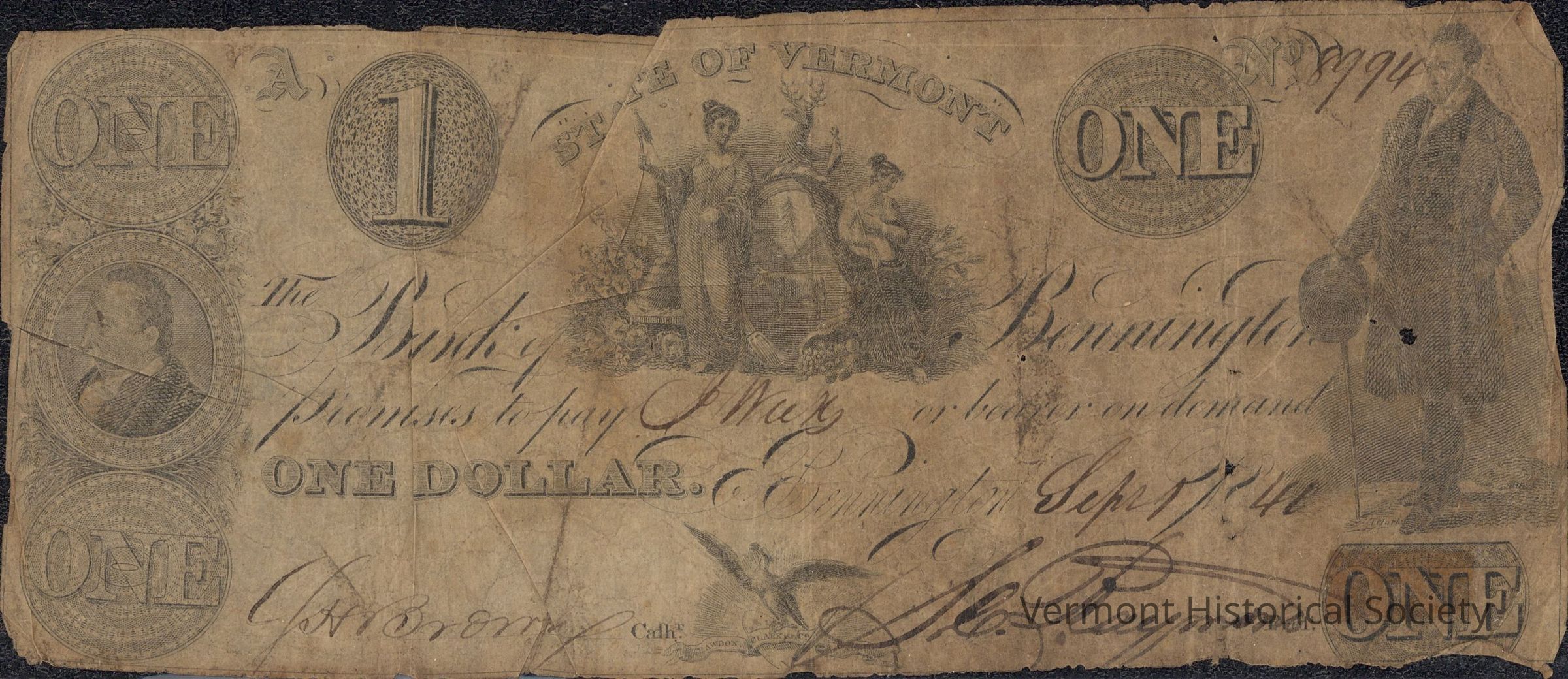 Private banknote for 1 dollar from The Bank of Bennington. It is made out to J. Wax (or bearer). The serial number is 8994, and it is dated Sept. 1, 1840.