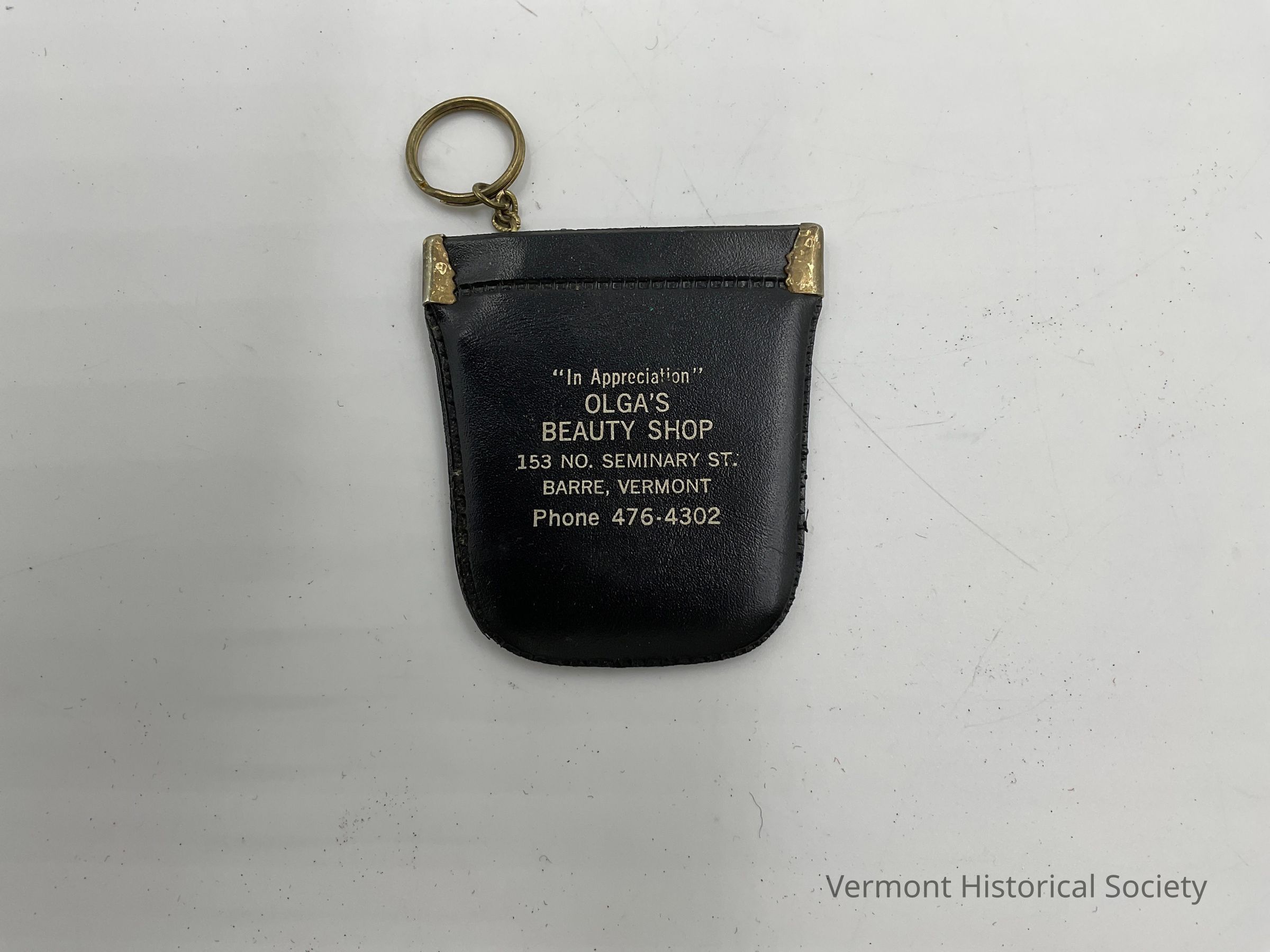 Black plastic change purse with ring to attach to something. The purse has a gold-printed advertisement that reads, "In appreciation, Olga's Beauty Shop, 153 no. Seminary St. Barre, Vermont, Phone 476-4302."Context