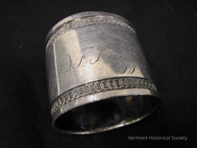 Round, silver napkin ring. The edges are engraved with a repeating patter of interlocking rings. The center is engraved, "D. F. Rugg".Context