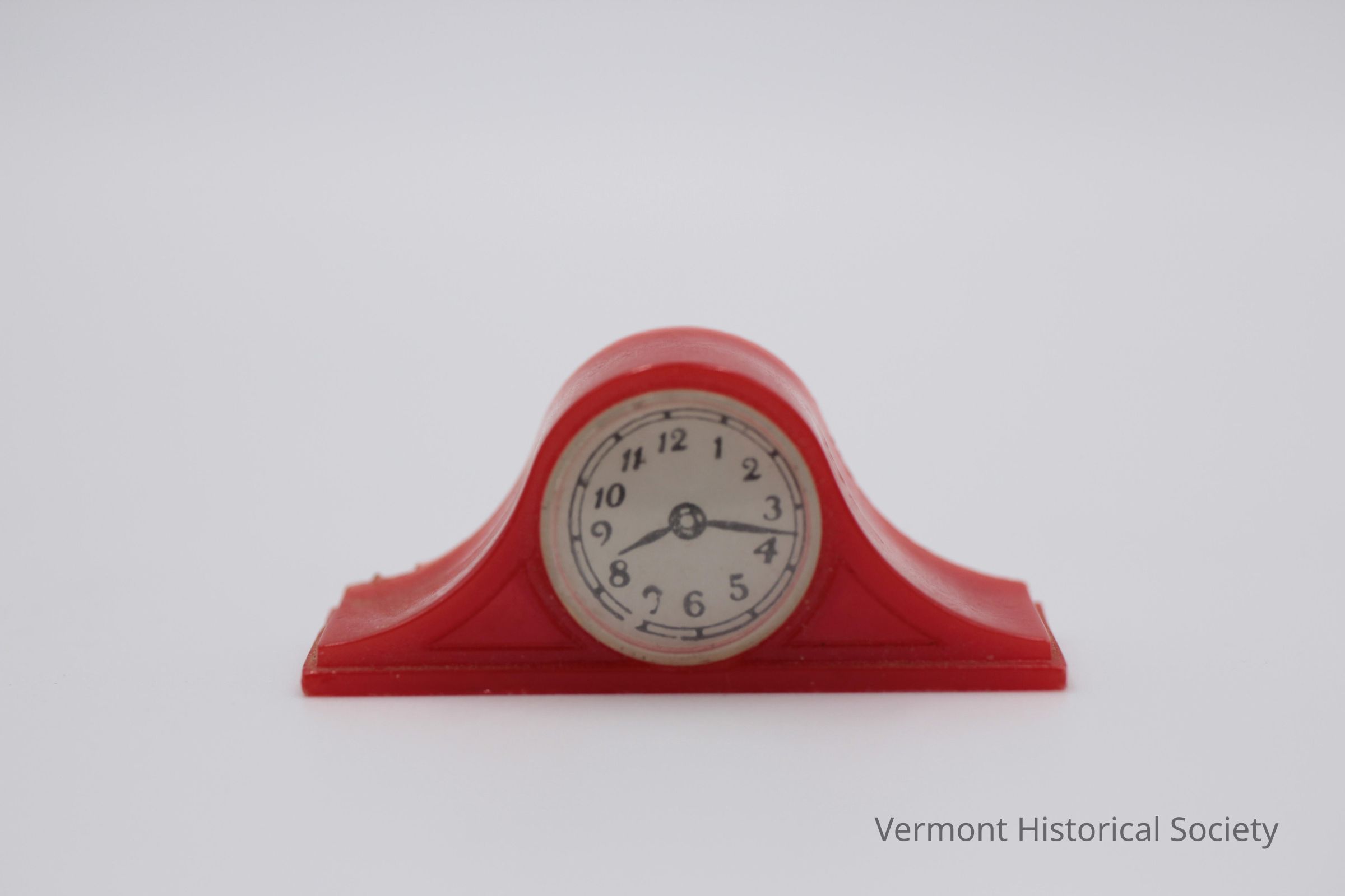 Miniature mantel clock molded from red plastic. The face is a white sticker printed with Arabic numerals. The hands indicate a time of 8:17. The back is molded with the words, "RENWAL / U.S.A. NO. 14."Context