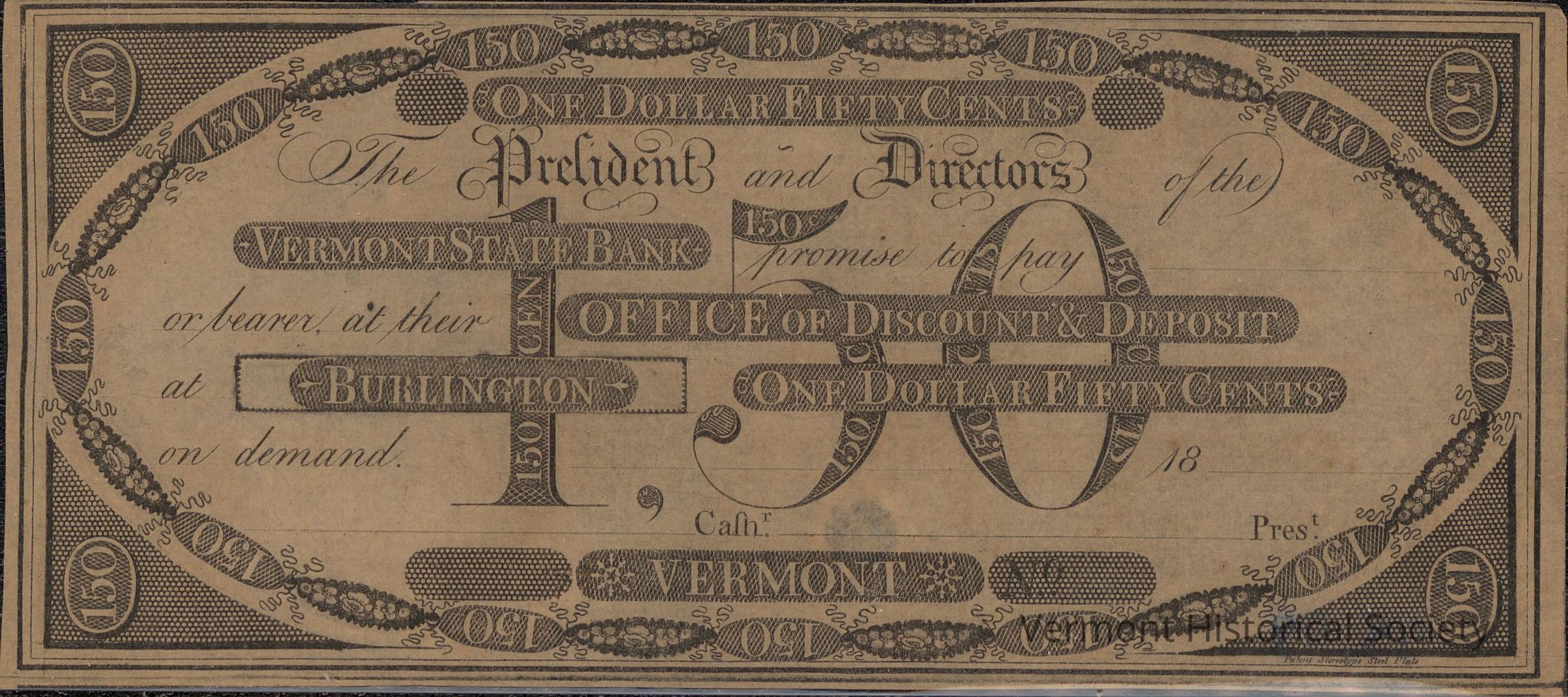 Private bank note for 1 dollar and 50 cents from Vermont State Bank in Burlington. It is unfilled and unsigned.
