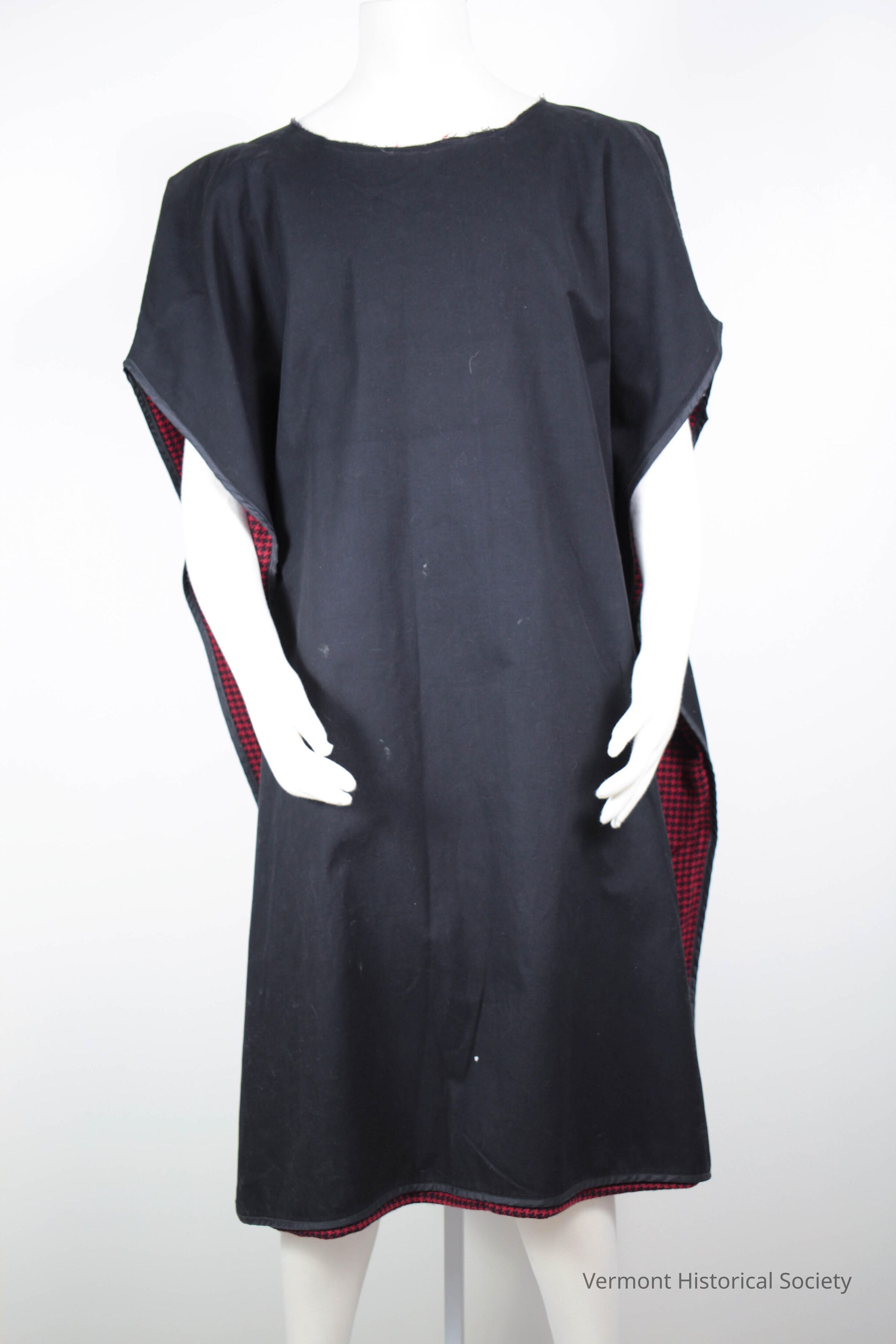 Wool poncho. The outer fabric is black wool (woven), and the entire poncho is lined with red-and-black hound's tooth wool. The poncho is constructed as a rectangle, with the front and back connected only at the shoulders. The shoulders are slightly shaped. The edges are bound with narrow, black wool tape, and the outer and inner layers are only connected at the edges. There is a large tag at the center back neckline that reads, "HUNTING TOSS SPORT CLOTHES JOHNSON MADE BY JOHNSON WOOLEN MILLS, INC. DRY CLEAN ONLY".Context