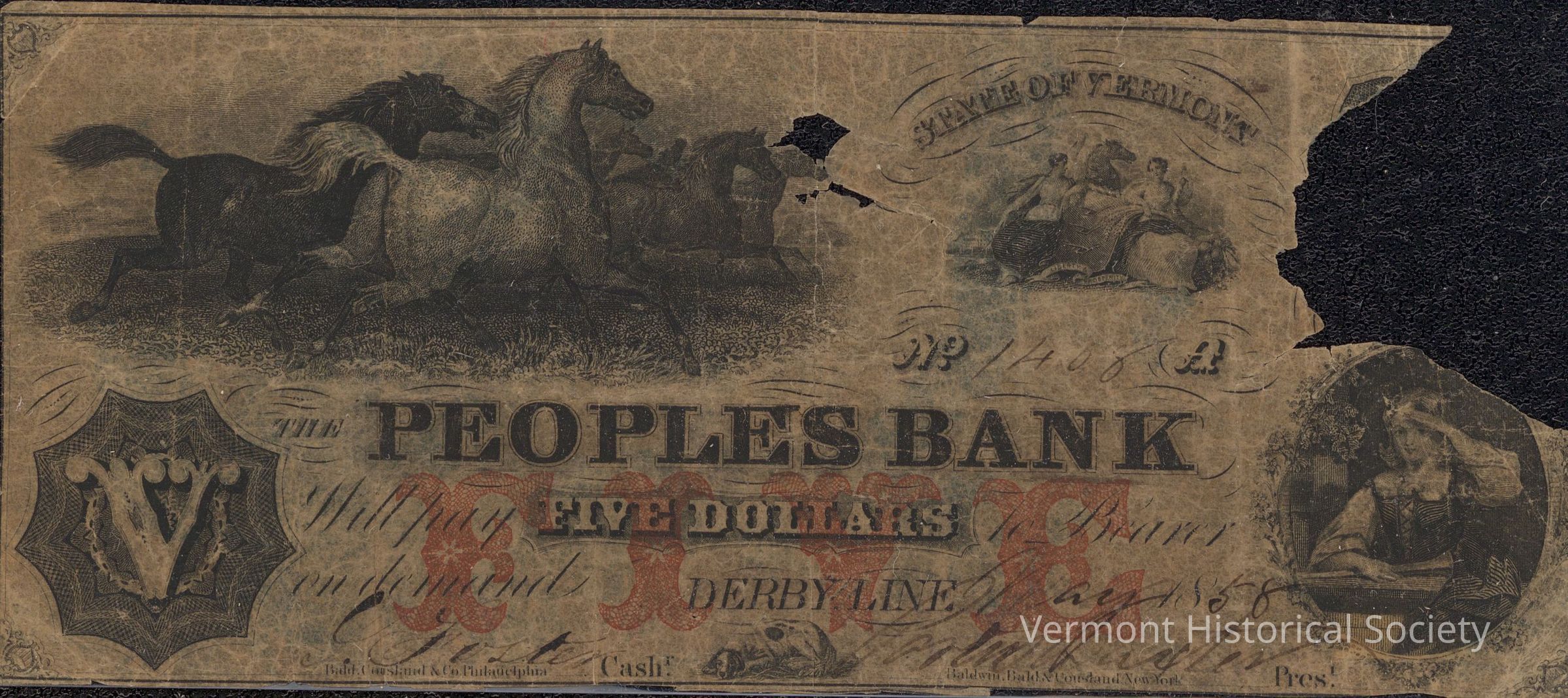 Private bank note for 5 dollars from The Peoples Bank in Derby Line, Vermont. The serial number is 1408 A, and it is dated May 1858.