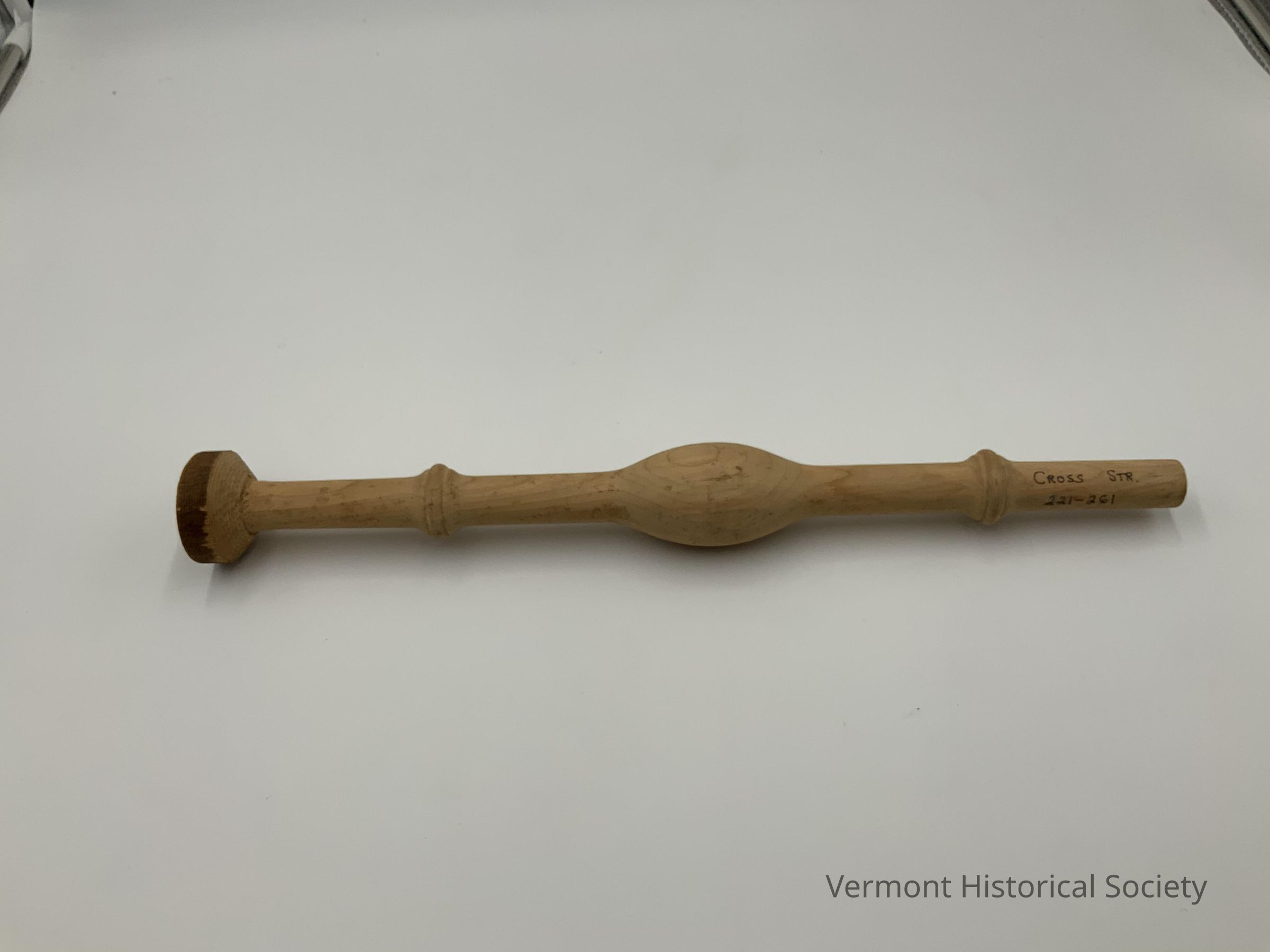 Piece of turned wood with the lathe tenon still attached. The turned section is uniform aside from two narrow, raised bands and a bulbous center. At the opposite end of the lathe tenon is the inked inscription, "CROSS STR./221-261".Context