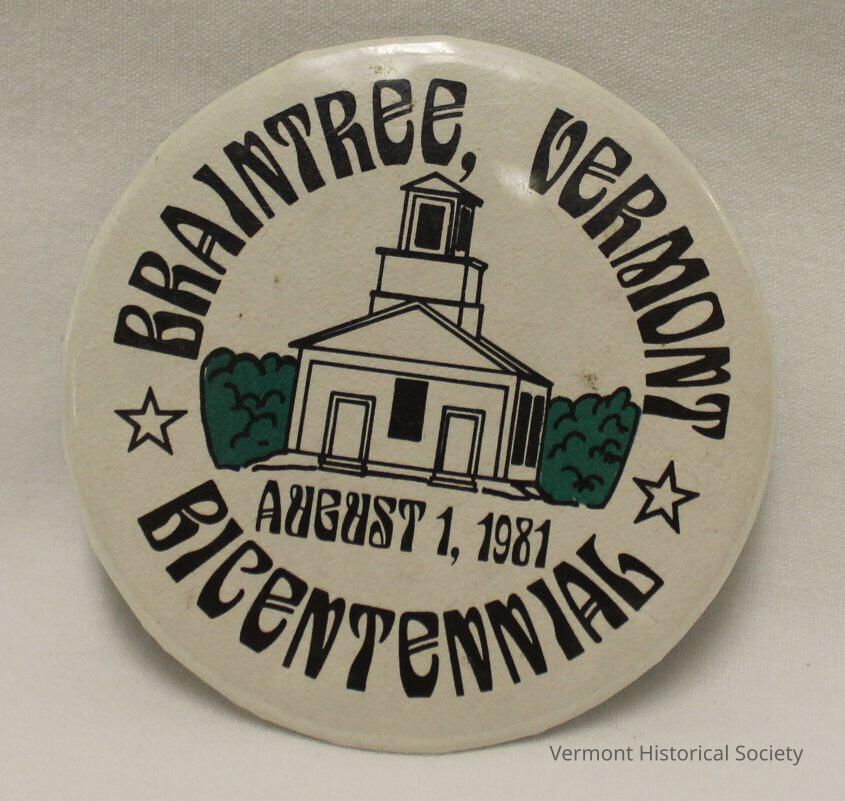Round white metal button printed with a line drawing of a church with the inscription, "BRAINTREE, VERMONT BICENTENNIAL" around the edge and the date "AUGUST 1, 1981" at the center beneath the image.Context