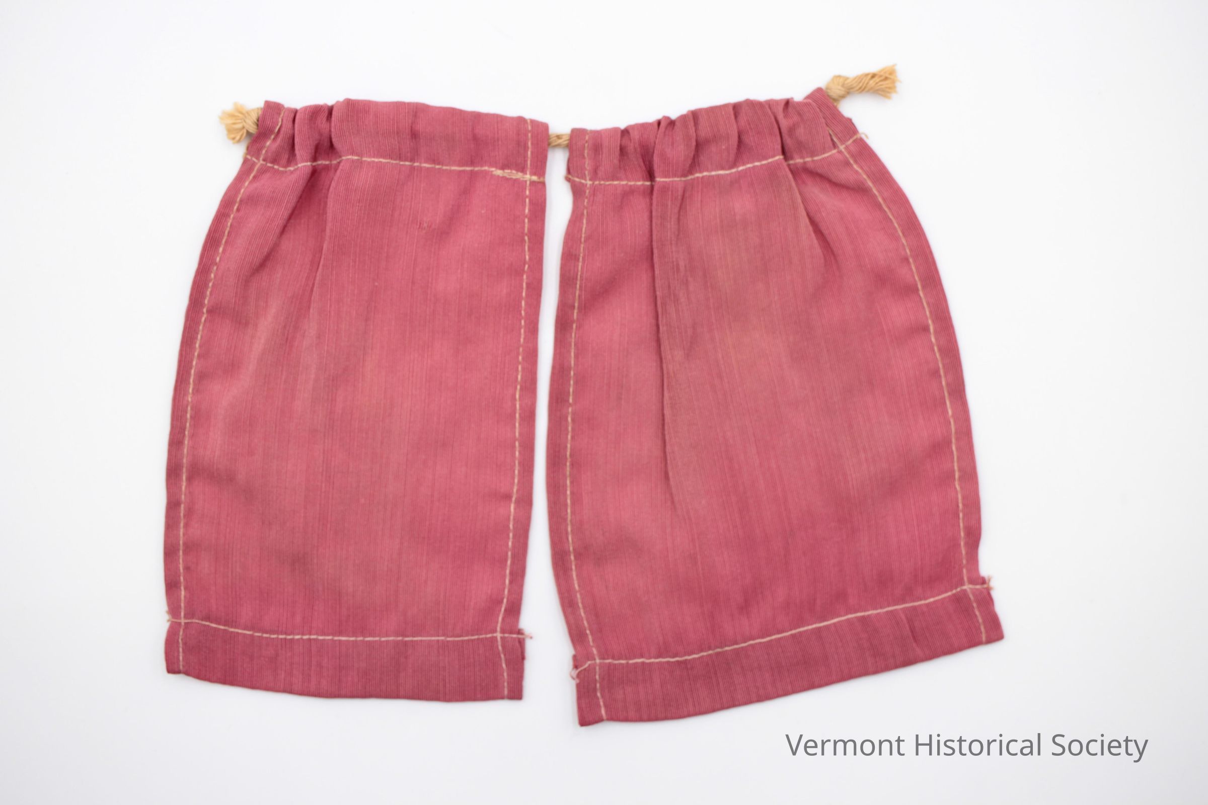 Two miniature curtains sized for dollhouse. Each curtain is made from pink, plain-woven cotton and machine-stitched with white thread. The vertical sides are hemmed, and the horizontal sides are turned into pocket channels. There is a length of twine strong through the upper channel, holding the curtains together.Context