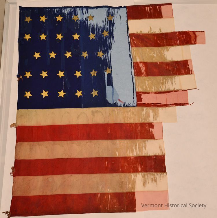 7th Vermont Infantry Regiment national flag. Red and white stripes with blue canton, gold stars, no fringe.