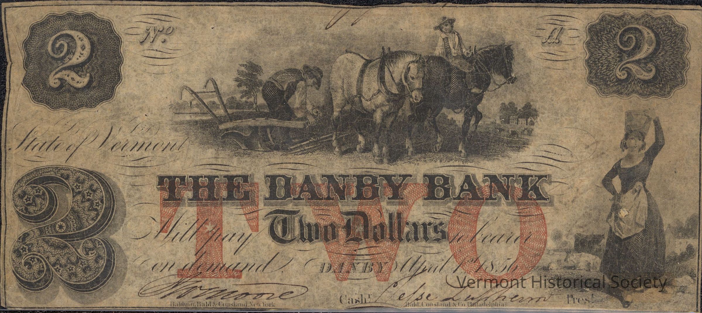 Private bank note for 2 dollars from The Danby Bank in Danby, Vermont. The serial number is blank. It is dated April 1st, 1856.