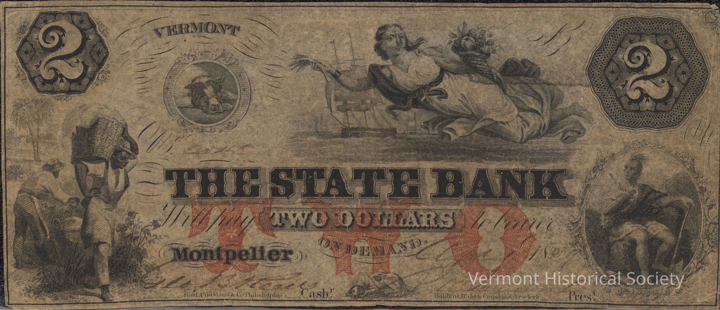 Private bank note for 2 dollars from The State Bank in Montpelier, Vermont. The serial number is 2045, and it is dated Apr. 1, 1804 (likely supposed to be 1864).Acquisition