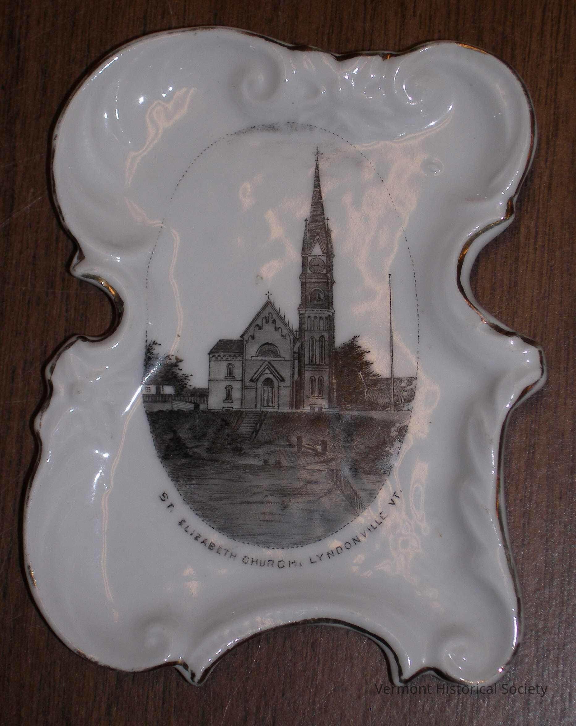 White porcelain card receiver with asymmetrical, rococo style edge. The center is printed with an engraved illustration of a gothic-revival church with a tall steeple. The image is labeled, "ST. ELIZABETH CHURCH, LYNDONVILLE VT." The reverse is marked, "Made in Germany for A. W. Brockway, Lyndonville, Vt."Context
