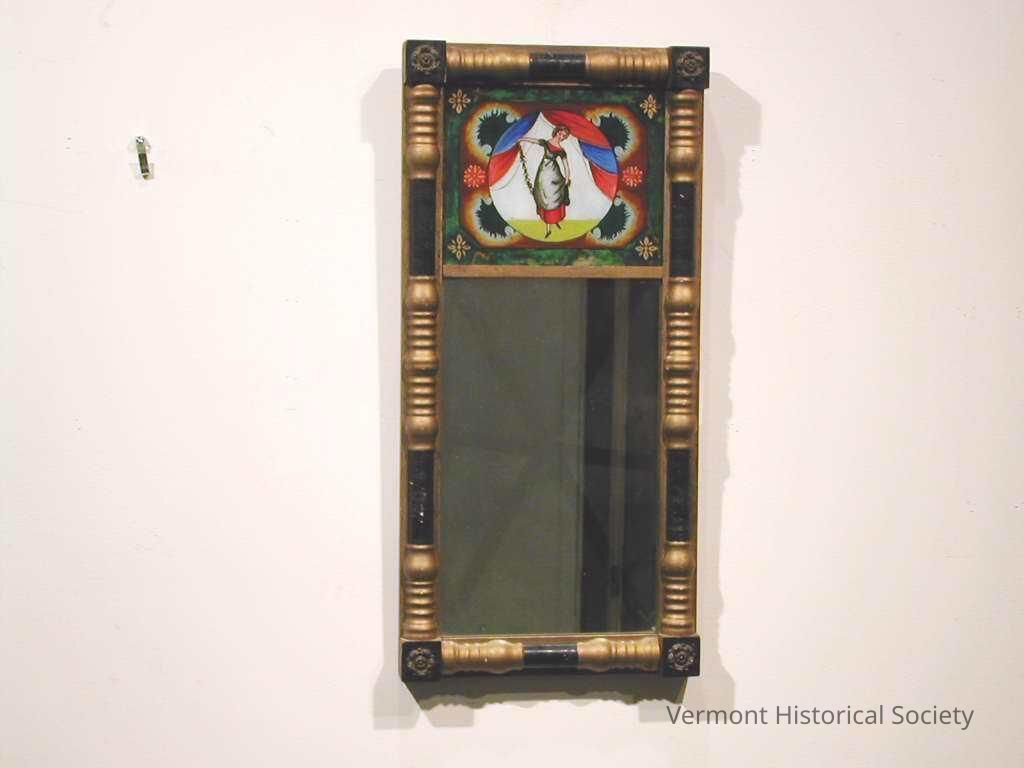 Wall mirror with wooden frame painted black and gold. The edges of the frame are decorated with black and gold applied (halved) spindles and have rosettes in the corners. The top section is a reverse painting on glass of a dancing girl. The bottom section is mirror. The back has a 'dust cover' of paperboard.