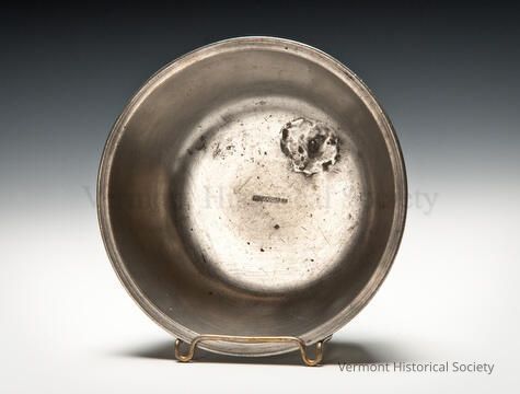 Round pewter basin with folded lip. The bottom interior is marked, "RICHARD.LEE".